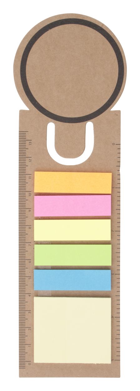 Lesezeichen / Lineal aus Papier mit Haftnotizen. Ein Ende mit Kreis-Motiv.