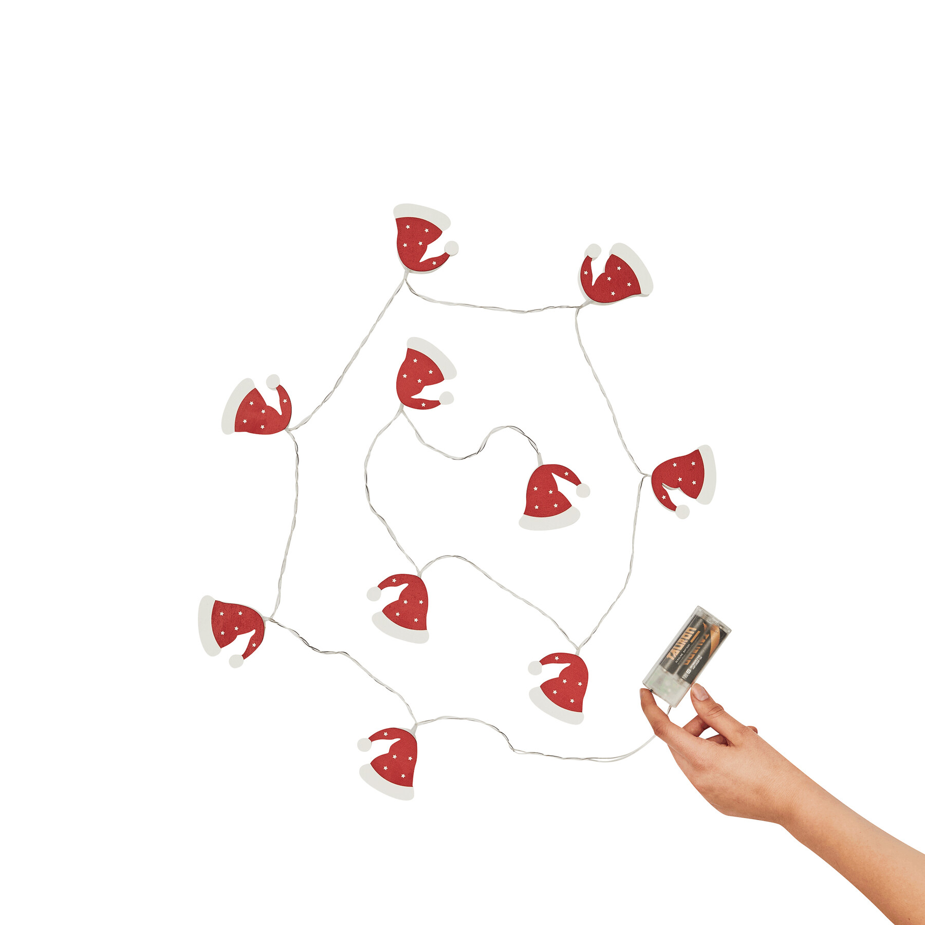 Lichterkette SANTA CAP: ca. 168 cm lang, jede der 10 Holz-Weihnachtsmützen wird mit einer warmweißen LED beleuchtet, Timerfunktion (6 Stunden an, 18 Stunden aus), batteriebetrieben (2x AA Batterien nicht enthalten), in Box