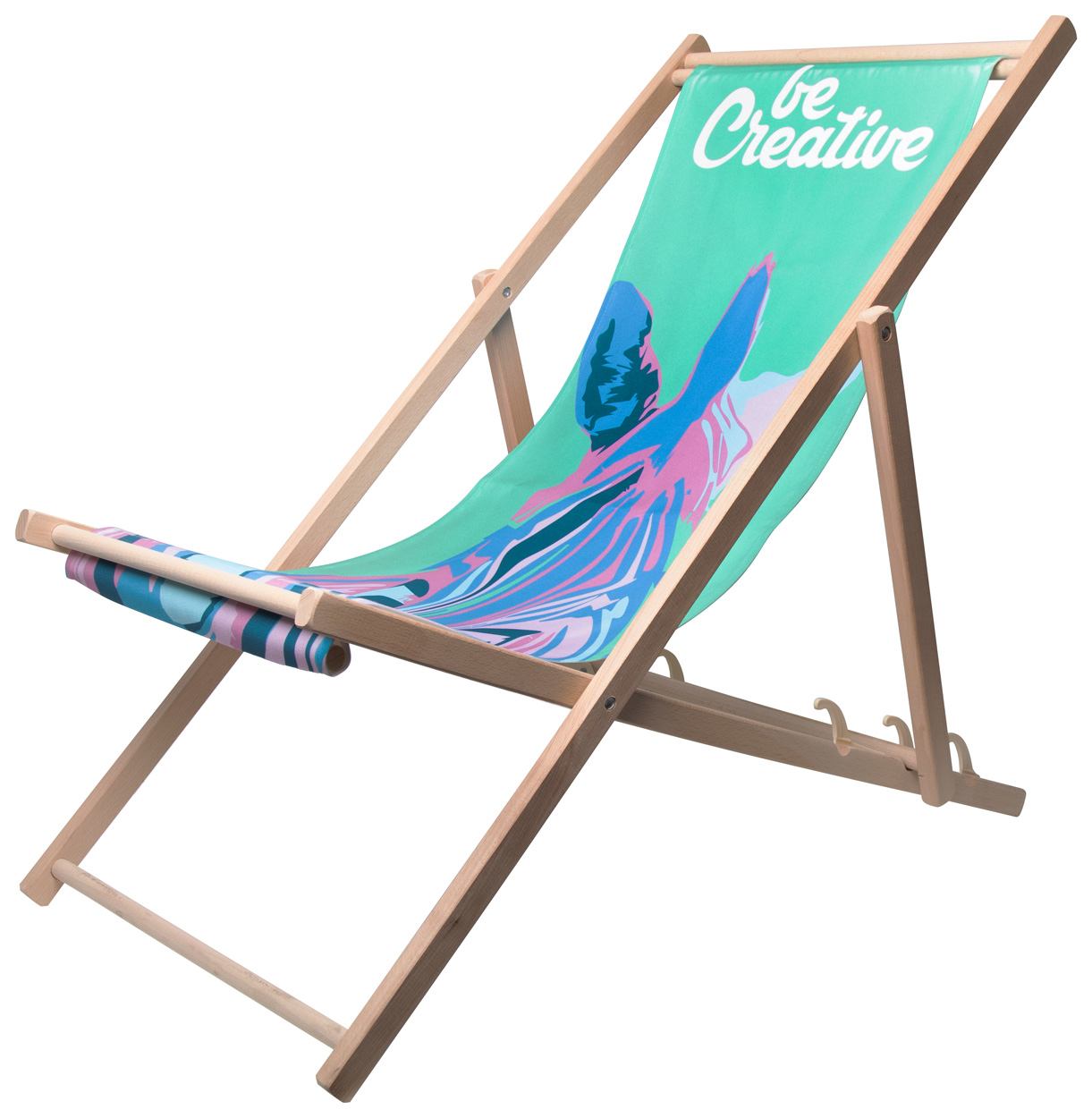 Liegestuhl aus Holz mit Bespannung aus 600D RPET Polyester mit vollflächigem Sublimationsdruck. Preis inkl. Sublimationsdruck auf der Vorderseite. Max. Tragegewicht: 100 kg. Mindestmenge: 5 Stk.