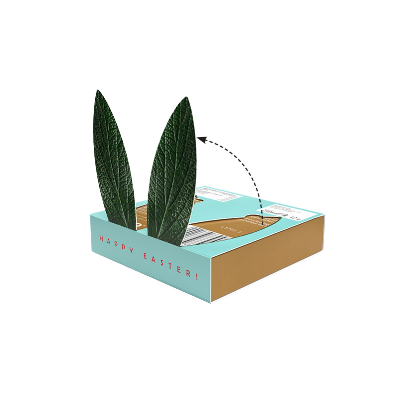 Lindt Mini Pralinés in Pralinenschachtel im Oster-Werbeschuber mit Hasenohren zum Herausbrechen und Aufstellen, individuell bedruckt. Inhalt: 9 Lindt Mini Pralinés: Coeur a l'orange, Macchiato Stern, Caramel Amande, Vollmilch mit Krokant, Marc de Champagne Trüffel, 44 g