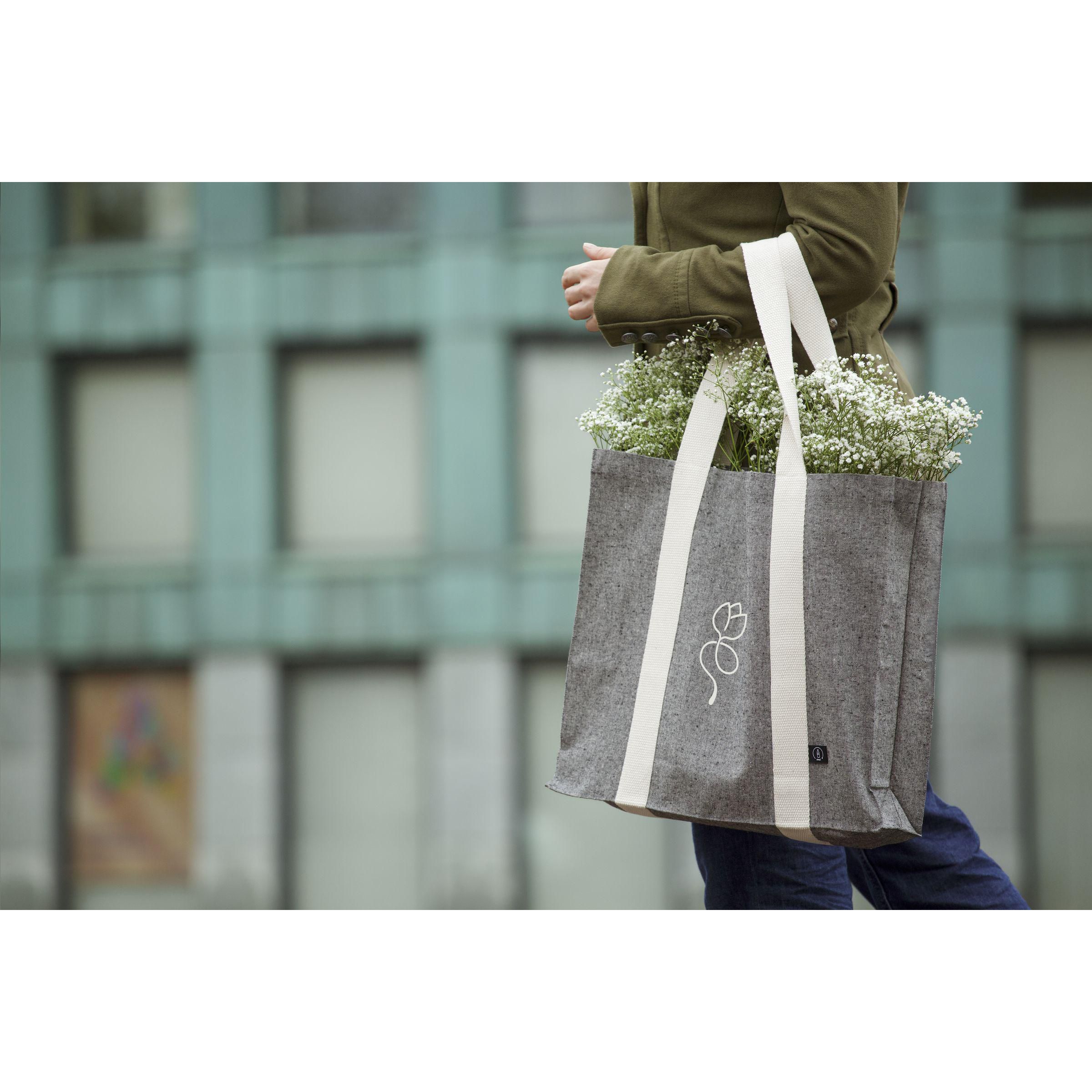 Geräumige, robuste Einkaufstasche aus 80% recyceltem, gemischtem Baumwolle und 20% recyceltem, gemischtem Polyester (210 g/m²). Mit dichtem, flachem Gewebe, langen Henkeln und breitem Boden. Die Henkel haben eine auffällige gewebte Struktur und verlaufen als robuste Bänder vertikal über die Tasche, ein schönes und dekoratives Detail. Die Tasche ist für den häufigen Gebrauch geeignet. GRS-zertifiziert. Fassungsvermögen ca. 18 Liter.