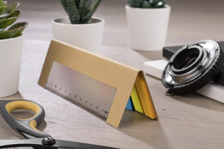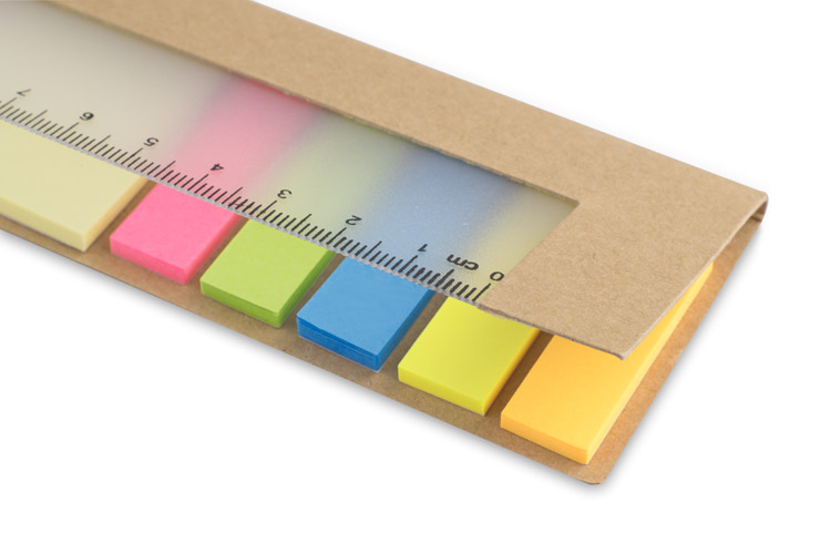 Praktisches Set, das aus buntem Haftnotizen und Lineal besteht. Unabdinglich für jeden Schreibtisch.