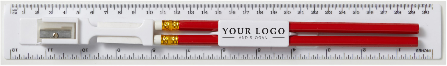 Lineal-Set aus Kunststoff, 5-tlg., inklusive Anspitzer, Radiergummi und zwei Bleistiften.