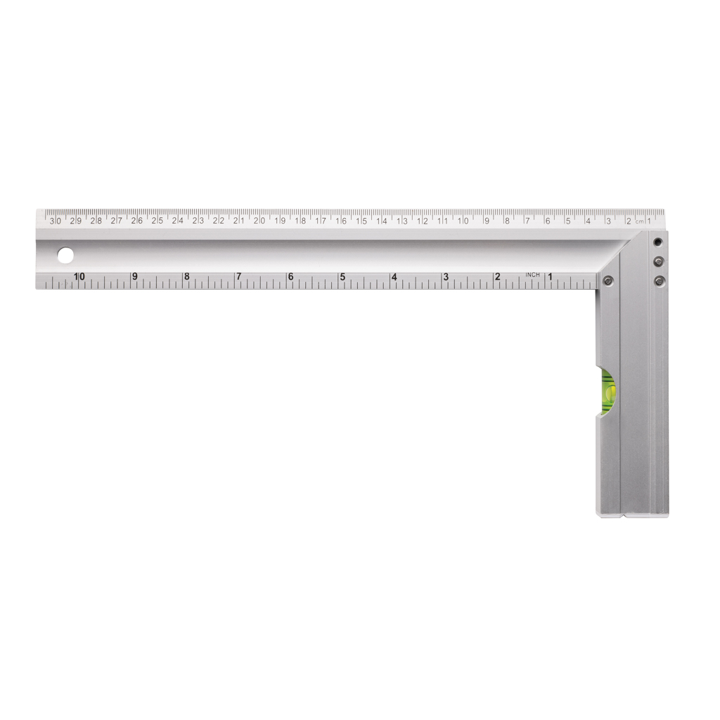 Professionelles Winkellineal aus Aluminium mit integrierter Wasserwaage optimal zum Messen von Ecken und zum Zeichnen von Quadraten. Beidseitiger Druck mit Angabe in cm (30) und Zoll (10). Genauigkeit 0,5mm / m