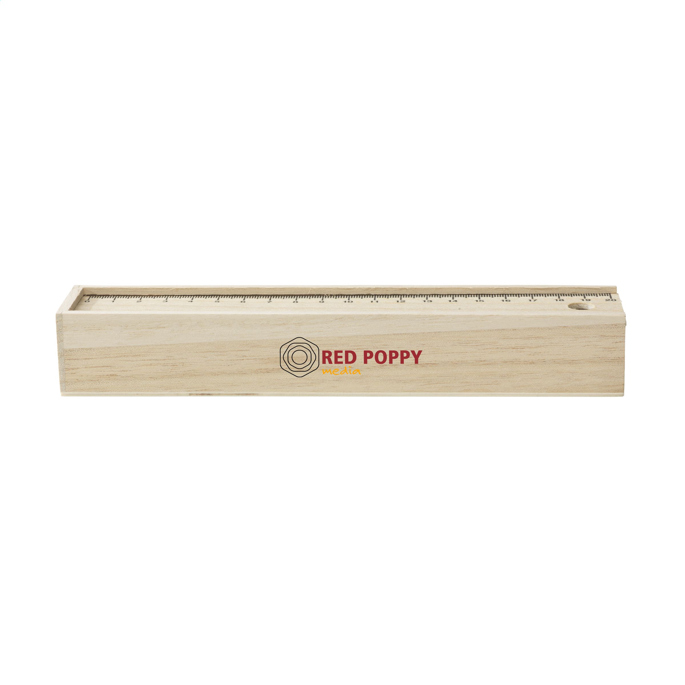Hölzerne Verwahrbox mit Deckel (Lineal 20 cm), 12 unlackierten, angespitzten Buntstiften und hölzernem Anspitzer.