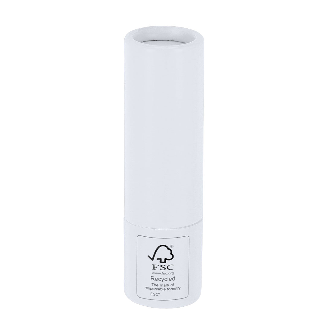 Lippenbalsam aus FSC-zertifiziertem recyceltem Karton. Vanilleduft. SPF15-Schutz. Dermatologisch getestet. FSC®-Label auf der Verpackung.