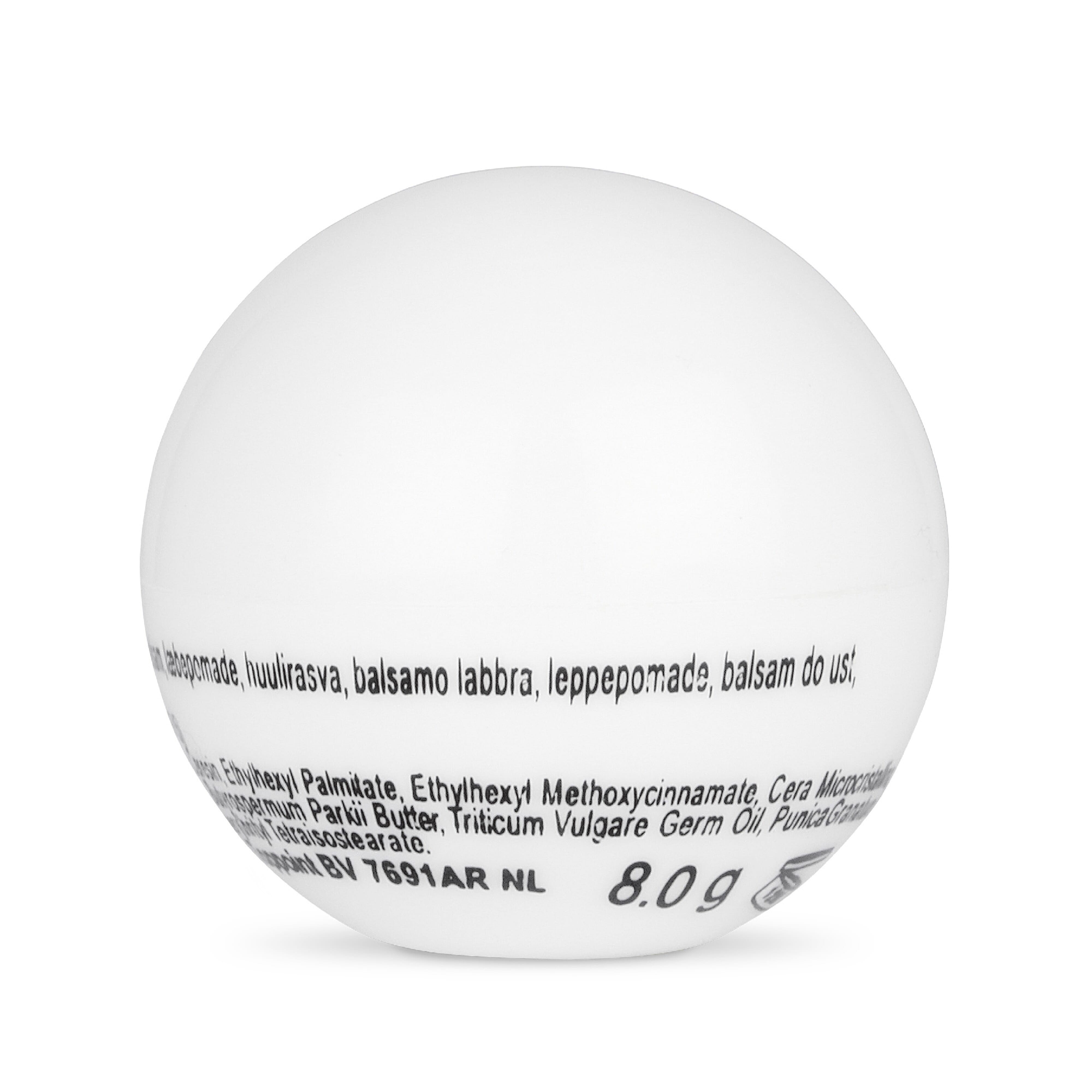 Lippenbalsam in einer kugelförmigen Kosmetikdose. Die Dose kann durch Drehen des Deckels geöffnet werden. Durch die flache Unterseite kann die Kugel nicht wegrollen.
