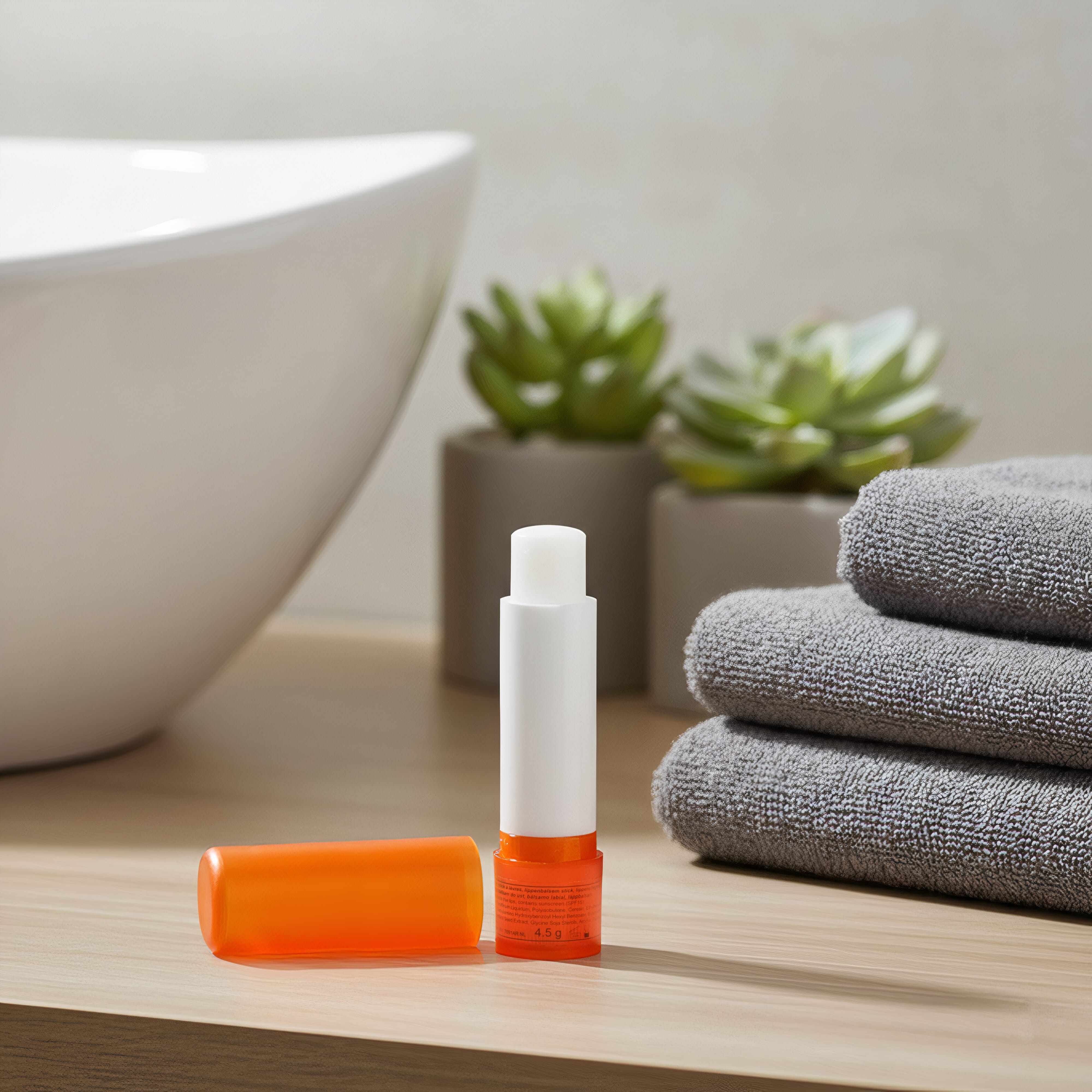Lippenbalsam (SPF15) in einem runden Gehäuse. An der Unterseite des Stifts ist ein Drehmechanismus zum herausdrehen des Pflegestifts. Lieferbar in transparenten Farben oder einfarbig in schwarz oder weiß.