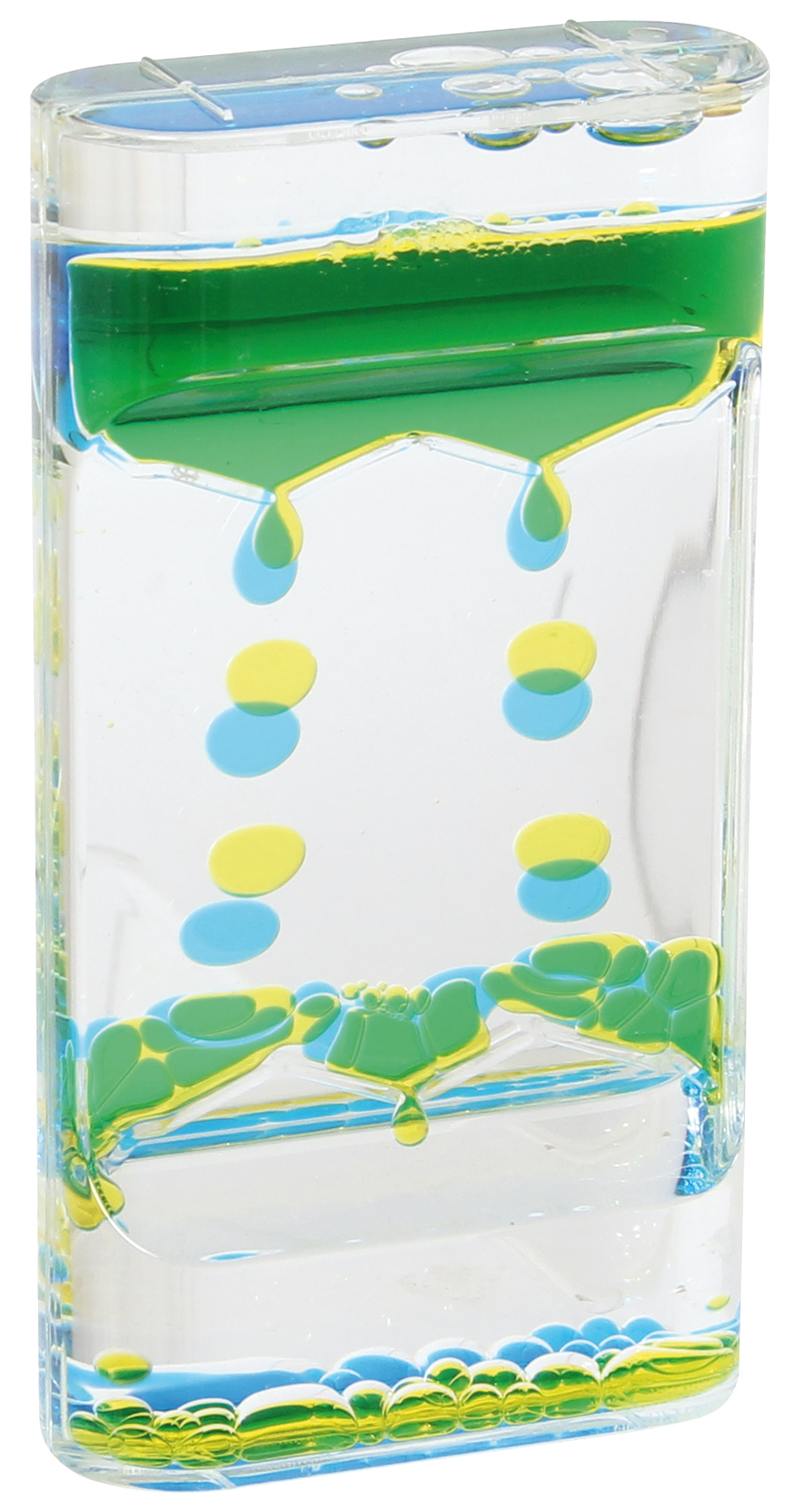 Aus Kunststoff. Verschiedene Farben sortiert. Zwei verschiedenfarbige Flüssigkeiten blubbern in getrennten Kammern nach unten und erzeugen wunderschöne Muster.