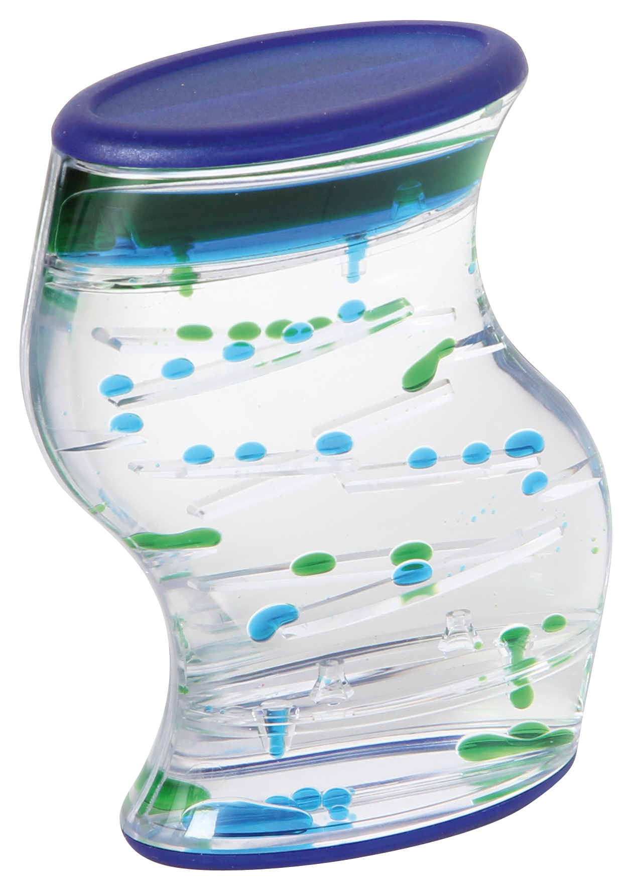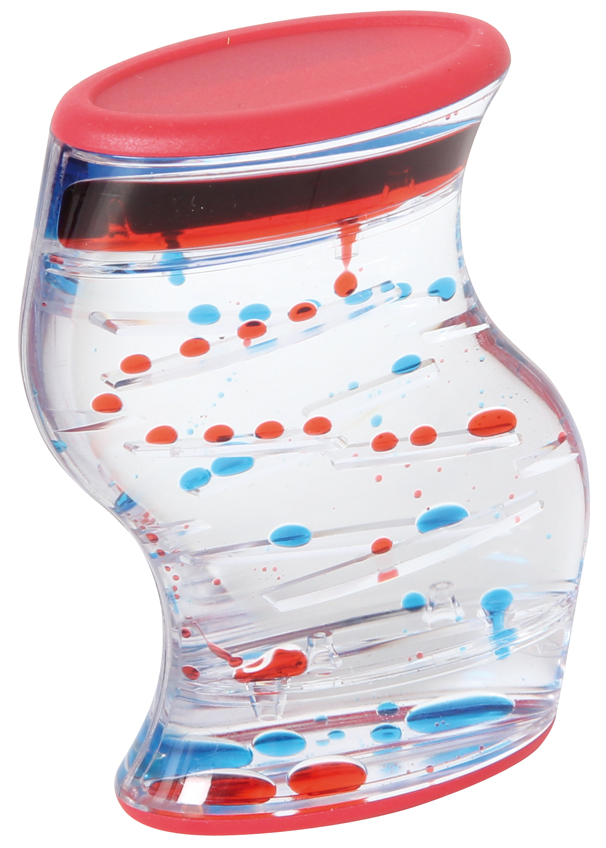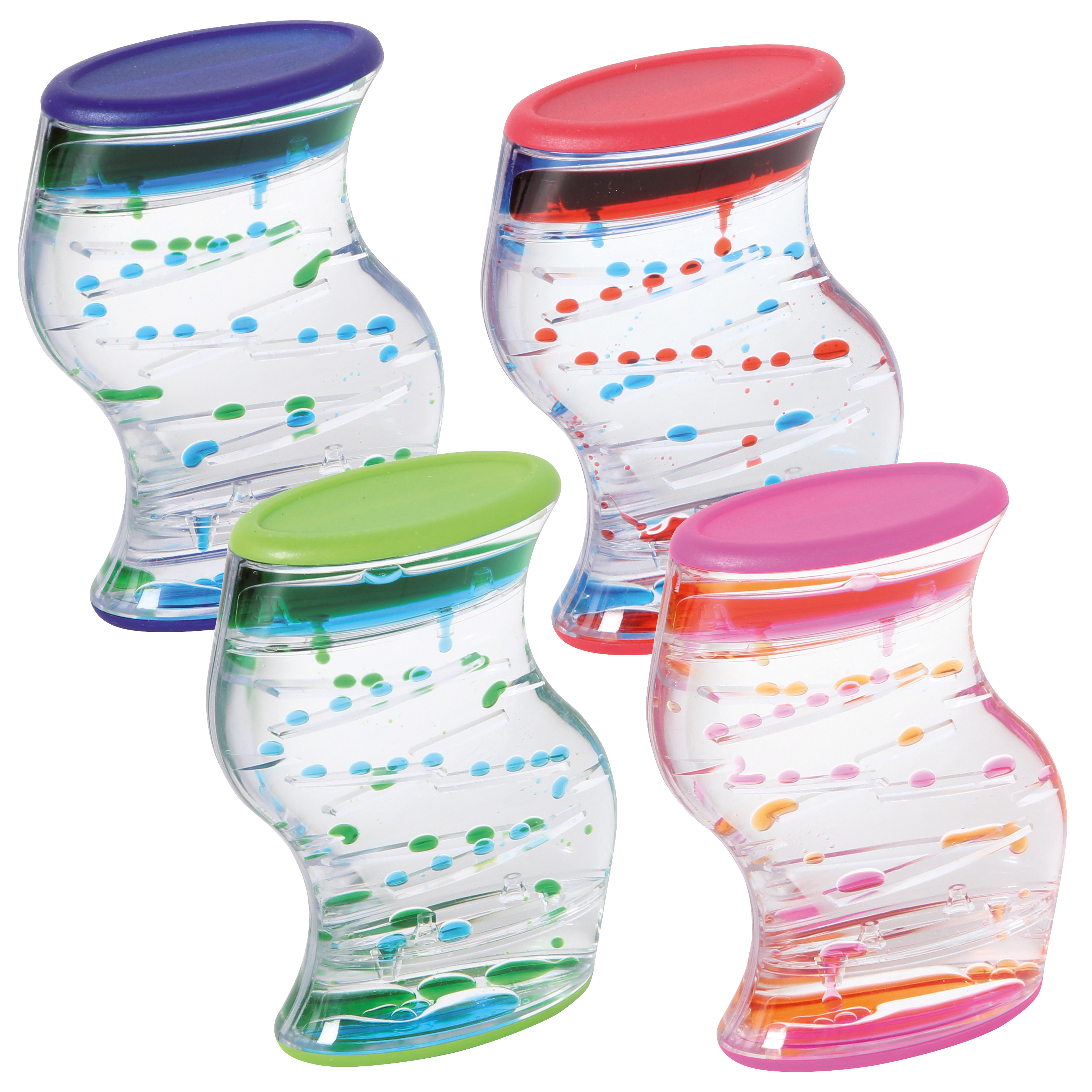 Aus Kunststoff. Vier Farben sortiert. Zwei verschiedenfarbige Flüssigkeiten blubbern in getrennten Kammern nach unten und erzeugen wunderschöne Muster.