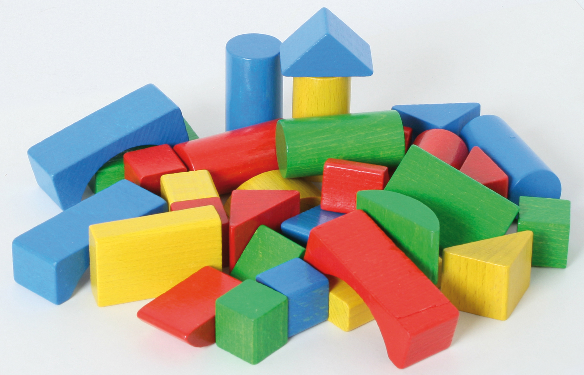 30 farbige Holzbausteine in Steckspiel-Trommel. Ab 1 Jahr.