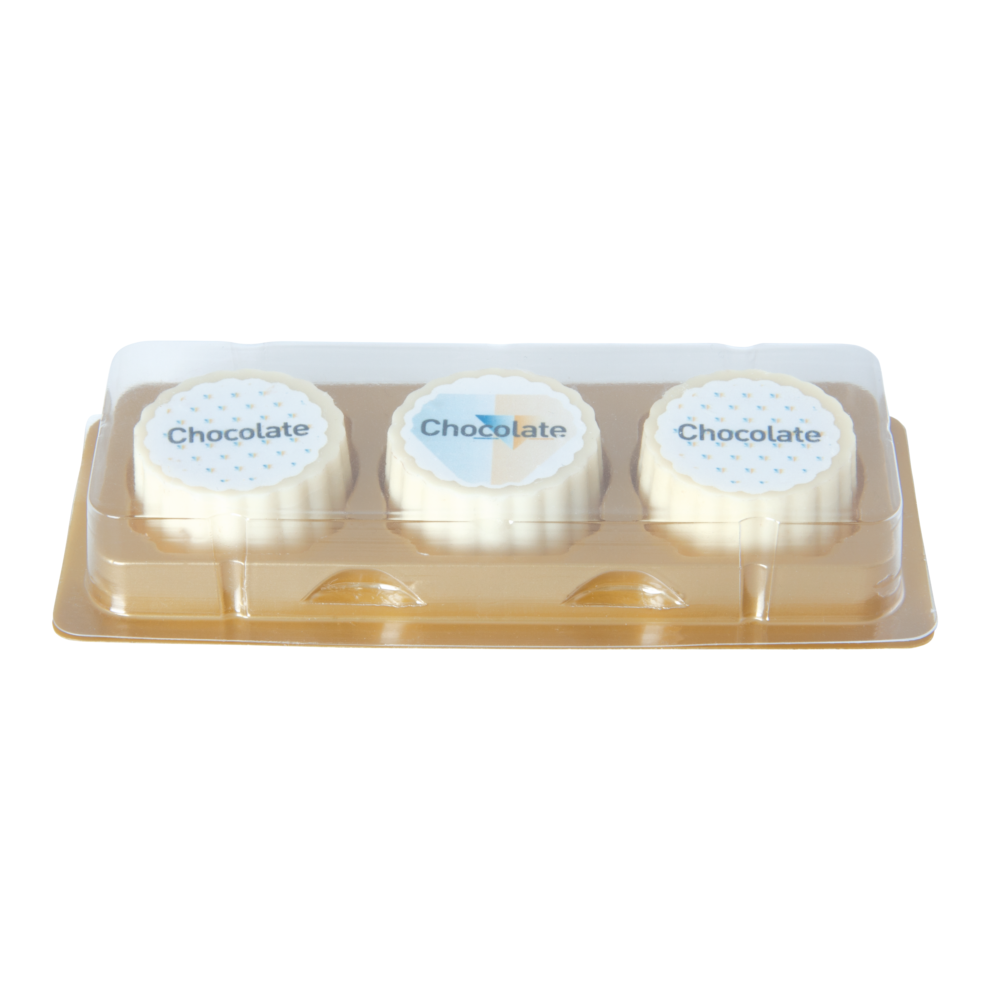 Logo-Praline aus weißer Schokolade mit Haselnuss Praliné Füllung, rechteckig oder rund, bis 4-c-bedruckt, 3er Verpackung