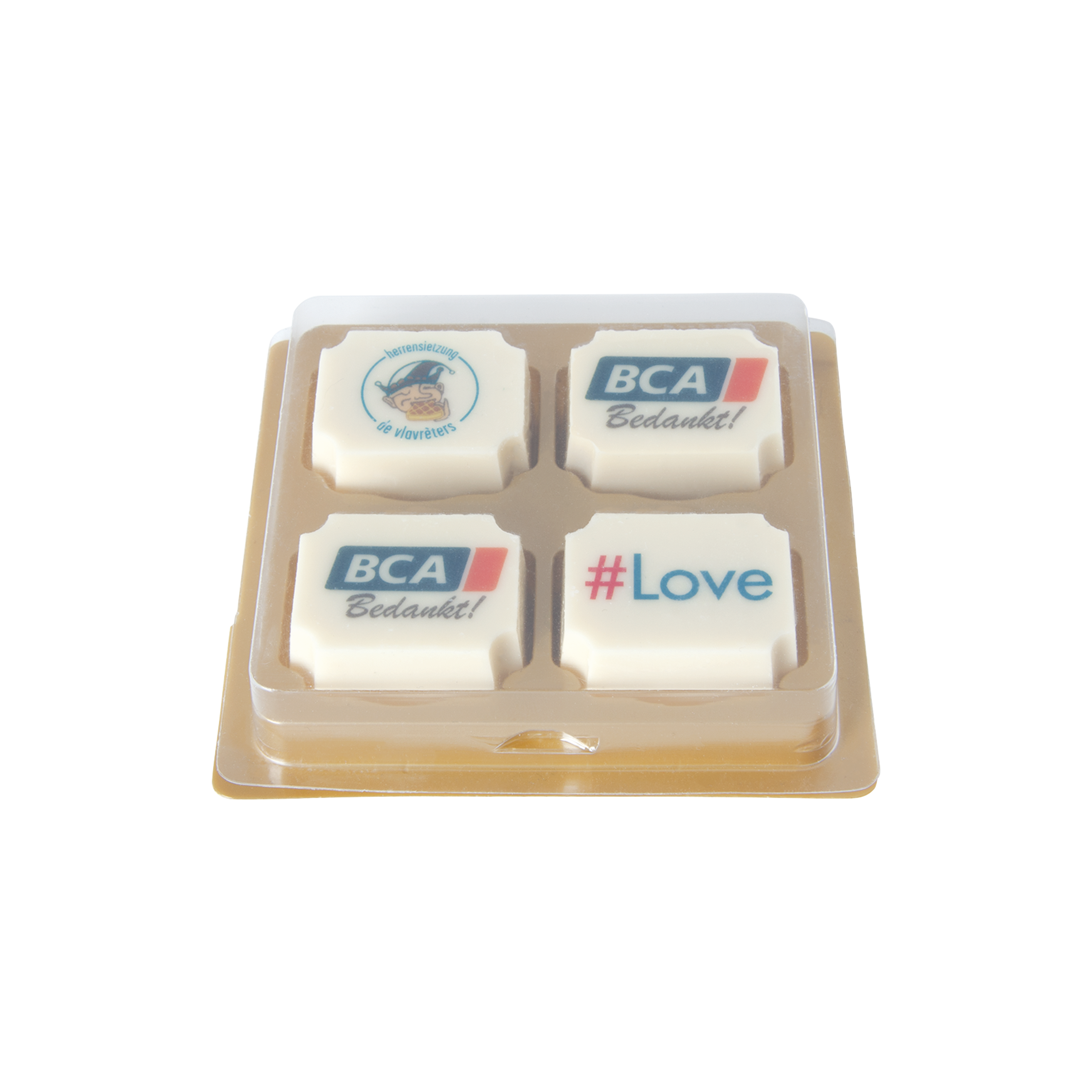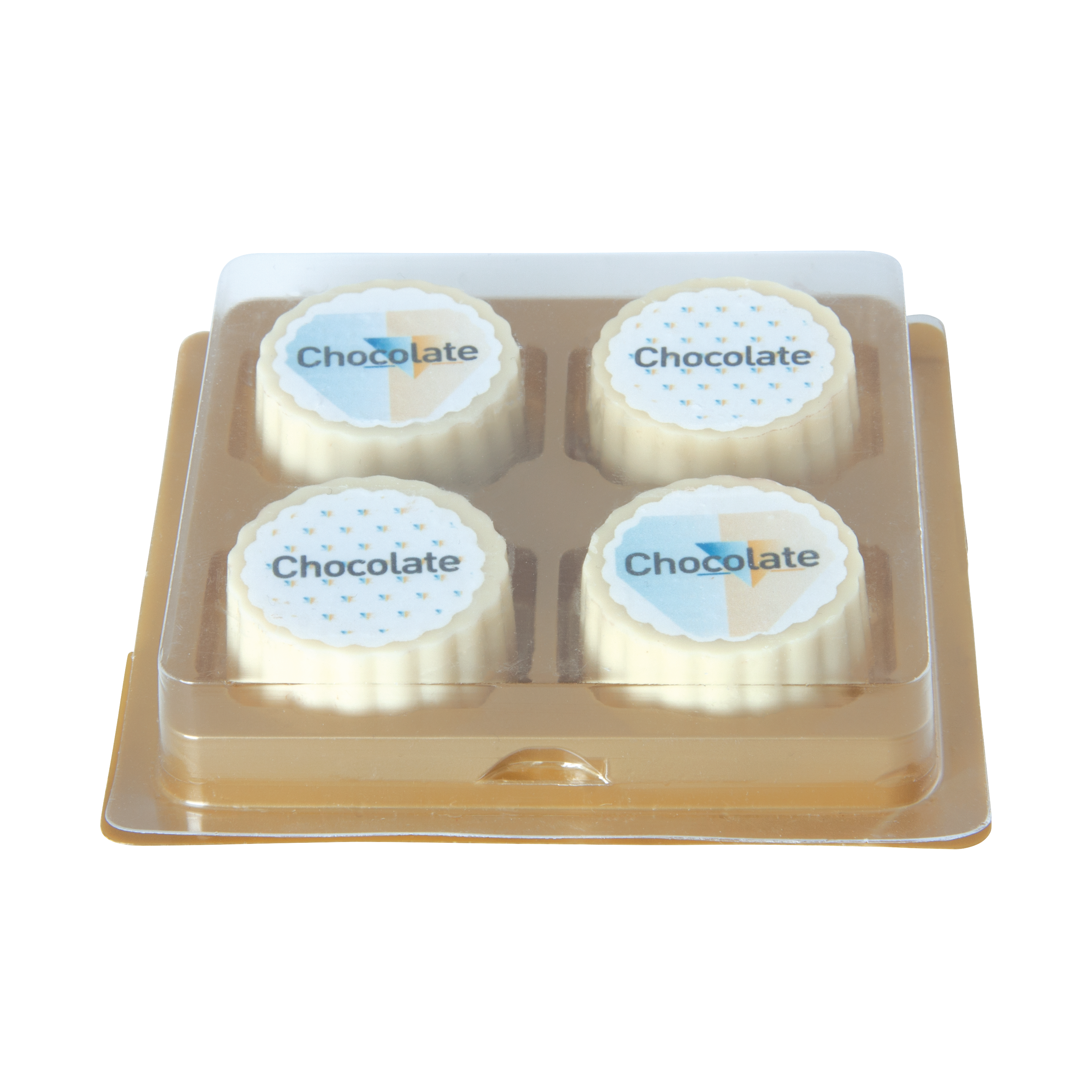 Logo-Praline aus weißer Schokolade mit Haselnuss Praliné Füllung, rechteckig oder rund, bis 4-c-bedruckt, 4er Verpackung