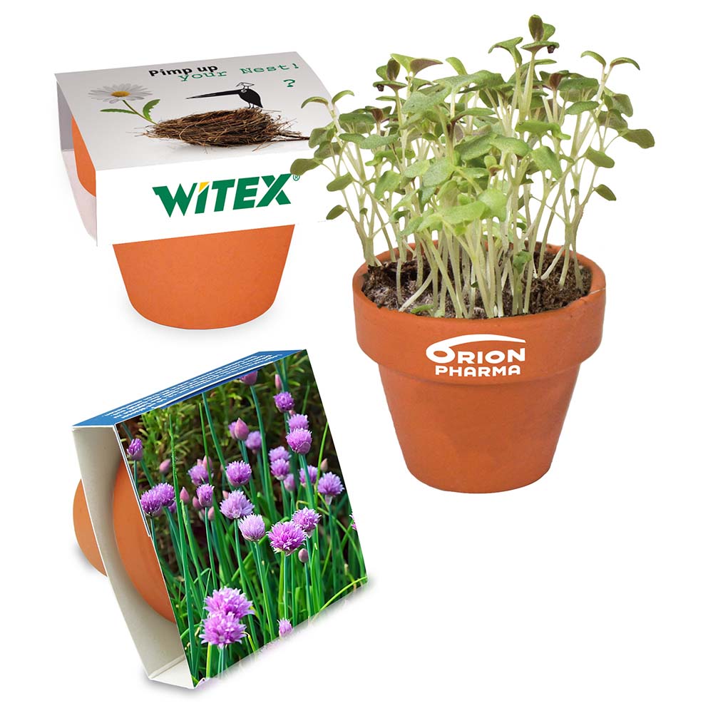 Für abwechslungsreiches Grün im Büro sorgt das Logo-Töpfchen aus Terracotta, das mit unterschiedlichen Samen, sowie einer Substrattablette als Erde geliefert wird. Mit diesem interaktiven Werbebotschafter wird der Kunde zum Gärtner und Ihr Unternehmen sorgt für ein wenig mehr Grün auf dieser Welt. Gleich doppelte Werbemöglichkeiten bietet dieses Töpfchen durch einen Logodruck auf dem Blumentopf und den im Digitaldruck 4-farbig, individuell gestaltbaren Verpackungsvarianten aus Karton.