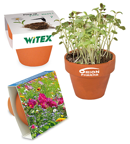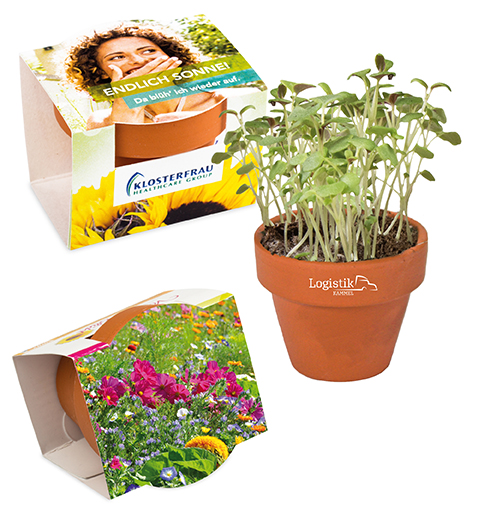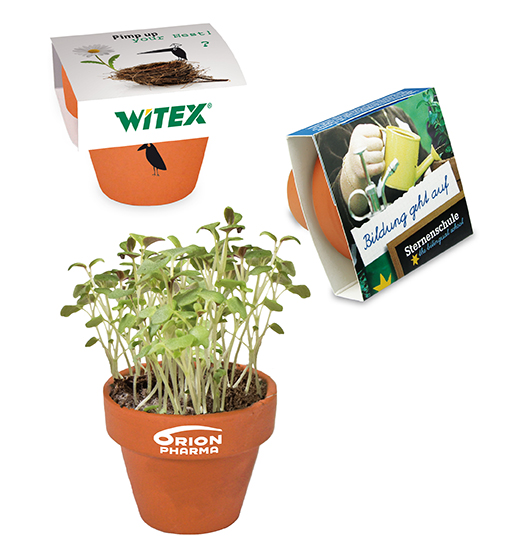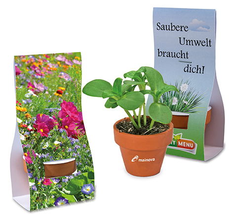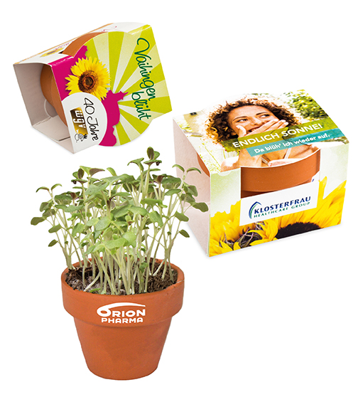 Für abwechslungsreiches Grün im Büro sorgt das Logo-Töpfchen aus Terracotta, das mit unterschiedlichen Samen, sowie einer Substrattablette als Erde geliefert wird. Mit diesem interaktiven Werbebotschafter wird der Kunde zum Gärtner und Ihr Unternehmen sorgt für ein wenig mehr Grün auf dieser Welt. Gleich doppelte Werbemöglichkeiten bietet dieses Töpfchen durch einen Logodruck auf dem Blumentopf und den im Digitaldruck 4-farbig, individuell gestaltbaren Verpackungsvarianten aus Karton.