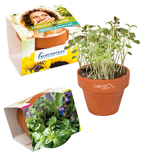 Für abwechslungsreiches Grün im Büro sorgt das Logo-Töpfchen aus Terracotta, das mit unterschiedlichen Samen, sowie einer Substrattablette als Erde geliefert wird. Mit diesem interaktiven Werbebotschafter wird der Kunde zum Gärtner und Ihr Unternehmen sorgt für ein wenig mehr Grün auf dieser Welt. Gleich doppelte Werbemöglichkeiten bietet dieses Töpfchen durch einen Logodruck auf dem Blumentopf und den im Digitaldruck 4-farbig, individuell gestaltbaren Verpackungsvarianten aus Karton.