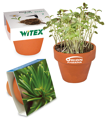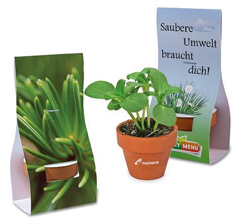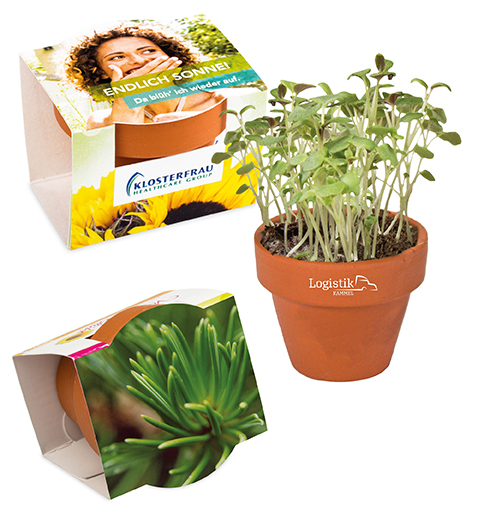 Für abwechslungsreiches Grün im Büro sorgt das Logo-Töpfchen aus Terracotta, das mit unterschiedlichen Samen, sowie einer Substrattablette als Erde geliefert wird. Mit diesem interaktiven Werbebotschafter wird der Kunde zum Gärtner und Ihr Unternehmen sorgt für ein wenig mehr Grün auf dieser Welt. Gleich doppelte Werbemöglichkeiten bietet dieses Töpfchen durch einen Logodruck auf dem Blumentopf und den im Digitaldruck 4-farbig, individuell gestaltbaren Verpackungsvarianten aus Karton.