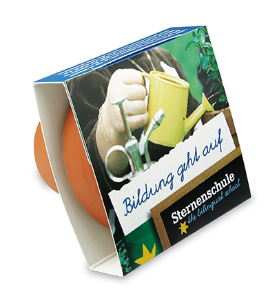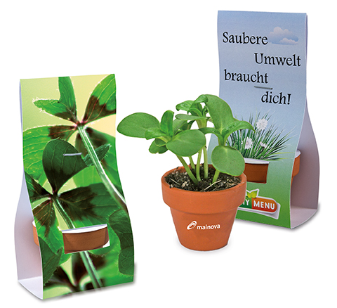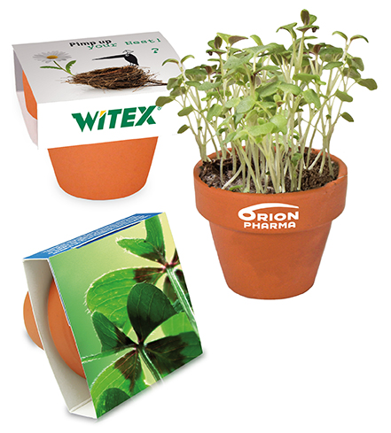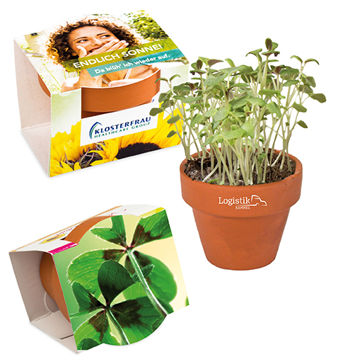 Für abwechslungsreiches Grün im Büro sorgt das Logo-Töpfchen aus Terracotta, das mit unterschiedlichen Samen, sowie einer Substrattablette als Erde geliefert wird. Mit diesem interaktiven Werbebotschafter wird der Kunde zum Gärtner und Ihr Unternehmen sorgt für ein wenig mehr Grün auf dieser Welt. Gleich doppelte Werbemöglichkeiten bietet dieses Töpfchen durch einen Logodruck auf dem Blumentopf und den im Digitaldruck 4-farbig, individuell gestaltbaren Verpackungsvarianten aus Karton.