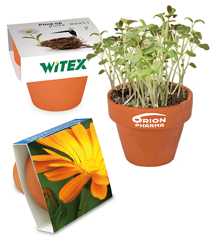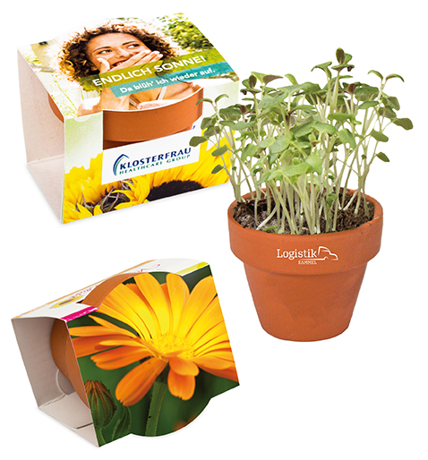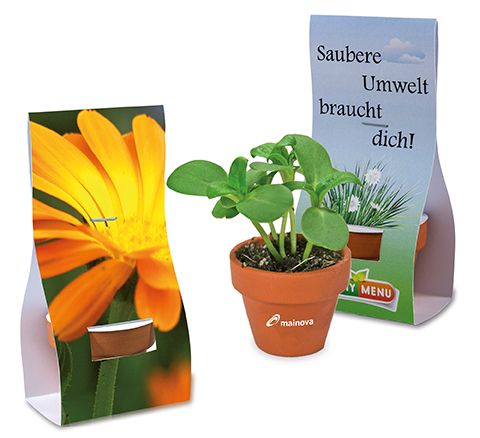 Für abwechslungsreiches Grün im Büro sorgt das Logo-Töpfchen aus Terracotta, das mit unterschiedlichen Samen, sowie einer Substrattablette als Erde geliefert wird. Mit diesem interaktiven Werbebotschafter wird der Kunde zum Gärtner und Ihr Unternehmen sorgt für ein wenig mehr Grün auf dieser Welt. Gleich doppelte Werbemöglichkeiten bietet dieses Töpfchen durch einen Logodruck auf dem Blumentopf und den im Digitaldruck 4-farbig, individuell gestaltbaren Verpackungsvarianten aus Karton.