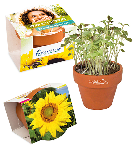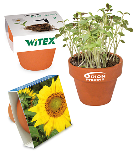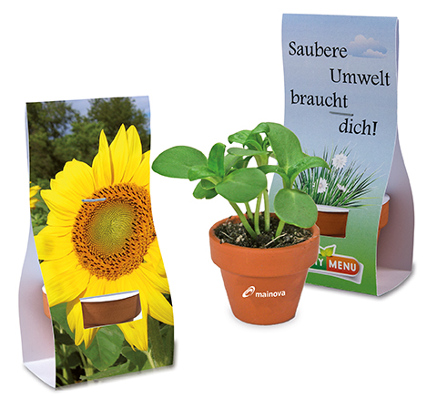 Für abwechslungsreiches Grün im Büro sorgt das Logo-Töpfchen aus Terracotta, das mit unterschiedlichen Samen, sowie einer Substrattablette als Erde geliefert wird. Mit diesem interaktiven Werbebotschafter wird der Kunde zum Gärtner und Ihr Unternehmen sorgt für ein wenig mehr Grün auf dieser Welt. Gleich doppelte Werbemöglichkeiten bietet dieses Töpfchen durch einen Logodruck auf dem Blumentopf und den im Digitaldruck 4-farbig, individuell gestaltbaren Verpackungsvarianten aus Karton.