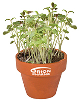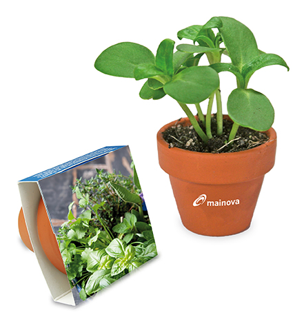 Der Logo-Topf mit Substrattablette und Pflanzensamen in Terracotta "natur", macht besonders hochwertig und stilvoll auf die Werbebotschaft aufmerksam. Verschiedene Samensorten in großer Auswahl sind als Inhalt im Topf lieferbar. Die Individualisierung erfolgt 4-c auf dem Karton sowie auf dem Rand oder der Seite des Töpfchens in 1-c.