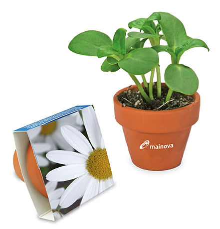 Der Logo-Topf mit Substrattablette und Pflanzensamen in Terracotta "natur", macht besonders hochwertig und stilvoll auf die Werbebotschaft aufmerksam. Verschiedene Samensorten in großer Auswahl sind als Inhalt im Topf lieferbar. Die Individualisierung erfolgt 4-c auf dem Karton sowie auf dem Rand oder der Seite des Töpfchens in 1-c.