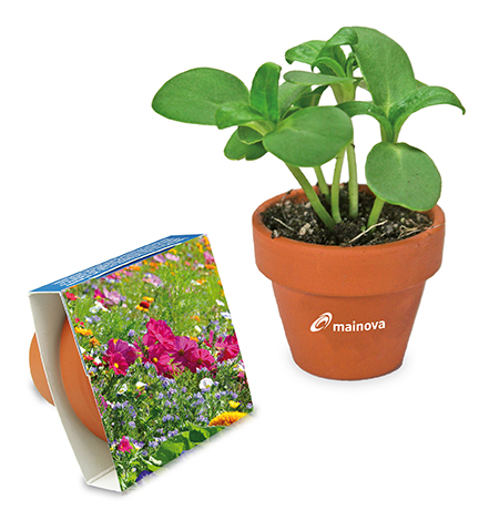 Der Logo-Topf mit Substrattablette und Pflanzensamen in Terracotta "natur", macht besonders hochwertig und stilvoll auf die Werbebotschaft aufmerksam. Verschiedene Samensorten in großer Auswahl sind als Inhalt im Topf lieferbar. Die Individualisierung erfolgt 4-c auf dem Karton sowie auf dem Rand oder der Seite des Töpfchens in 1-c.