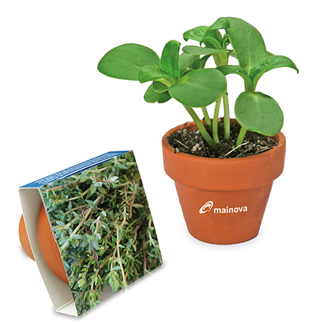 Der Logo-Topf mit Substrattablette und Pflanzensamen in Terracotta "natur", macht besonders hochwertig und stilvoll auf die Werbebotschaft aufmerksam. Verschiedene Samensorten in großer Auswahl sind als Inhalt im Topf lieferbar. Die Individualisierung erfolgt 4-c auf dem Karton sowie auf dem Rand oder der Seite des Töpfchens in 1-c.