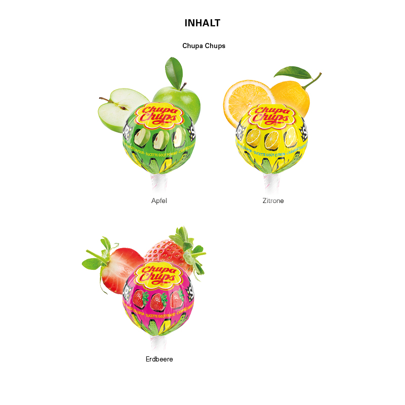 Chupa Chups Kugel Lolly Sour in Werbebox aus weißem Karton, individuell bedruckt. Inhalt: 1 Chupa Chups Kugel Lolly sour, Fruchtmischung (Apfel, Erdbeere, Zitrone) 12 g