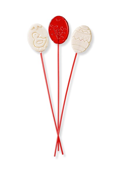 Frucht-Lolly mit flexiblem Stiel. Lolly-Größe max. 5 x 5 cm. Kunststoff-Stiel Länge ca. 25 cm. Standardformen: Herz, Fußball, Spirale, Osterei, Blume. Andere Sonderformen auf Anfrage,