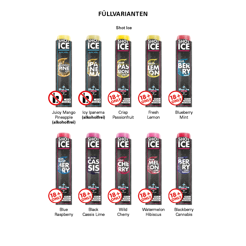 1 Shot Ice Wassereis, Blue Raspberry oder 1 Shot Ice Wassereis, Crisp Passion Fruit mit Wodka oder 1 Shot Ice Wassereis, Blue Berry Mint mit Wodka oder 1 Shot Ice Wassereis, Black Cassis Lime mit Wodka oder 1 Shot Ice Wassereis, Watermelon & Hib ...