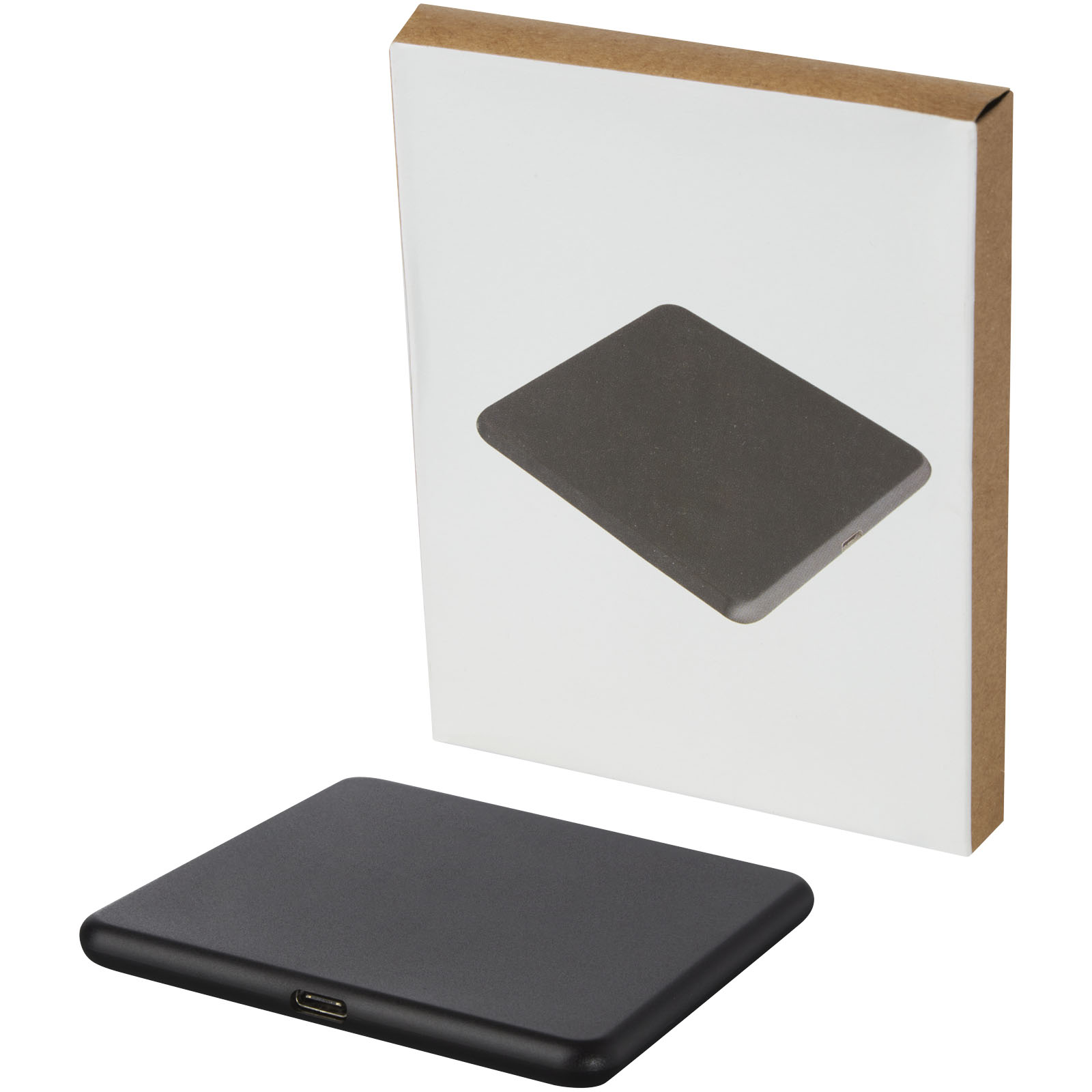 Kabelloses Ladepad aus recyceltem ABS Kunststoff. Verbinden Sie das Ladepad mit einem Computer oder Laptop und legen Sie das Gerät darauf, um den Ladevorgang zu starten. Die kabellose Leistungsabgabe beträgt 10 W (max.) für schnelles Aufladen. Kompatibel mit allen Qi Geräten (iPhone 8 oder höher und Android Geräte, die kabelloses Laden unterstützen). Auslieferung in einer Geschenkbox inklusive Bedienungsanleitung (beides aus nachhaltigen Materialien).