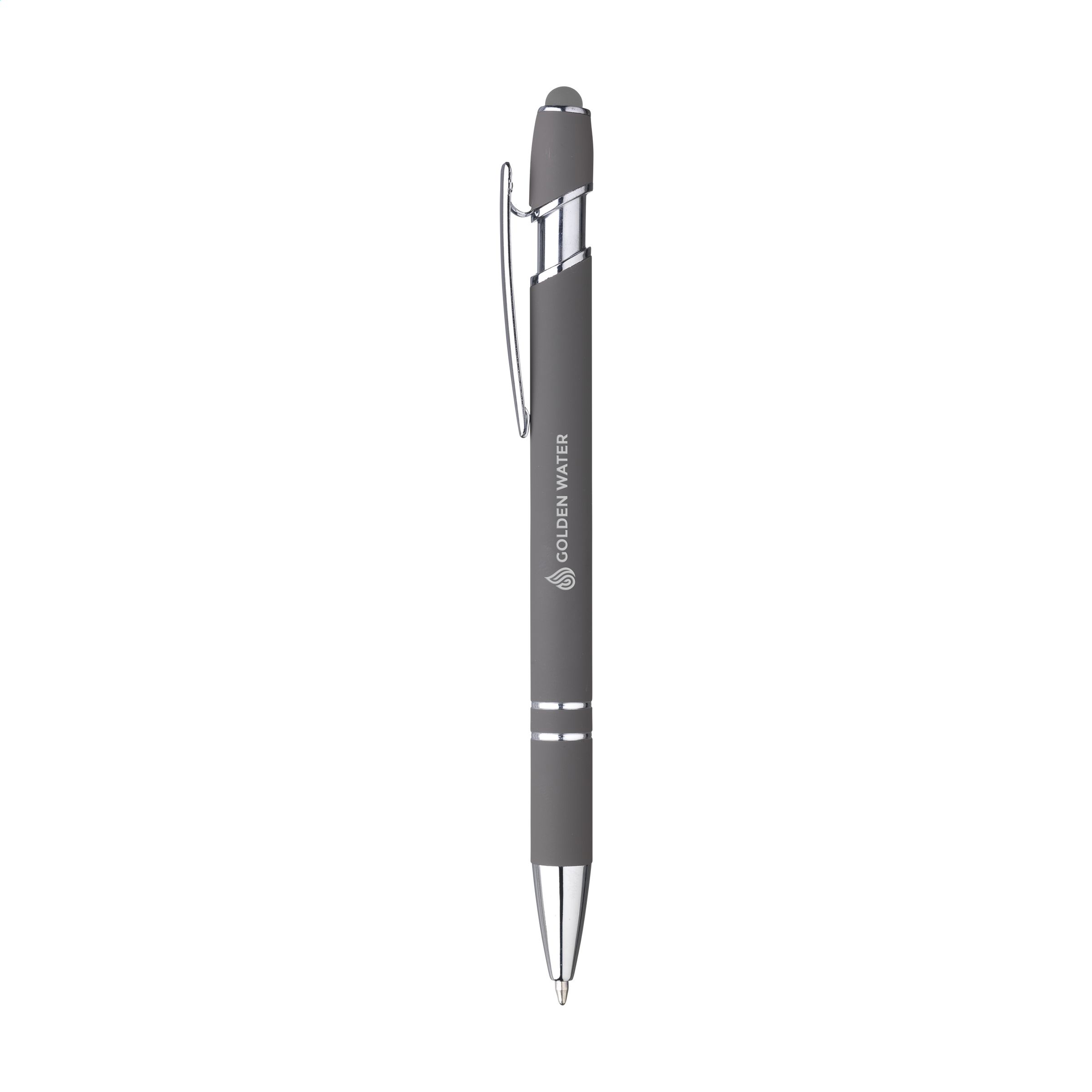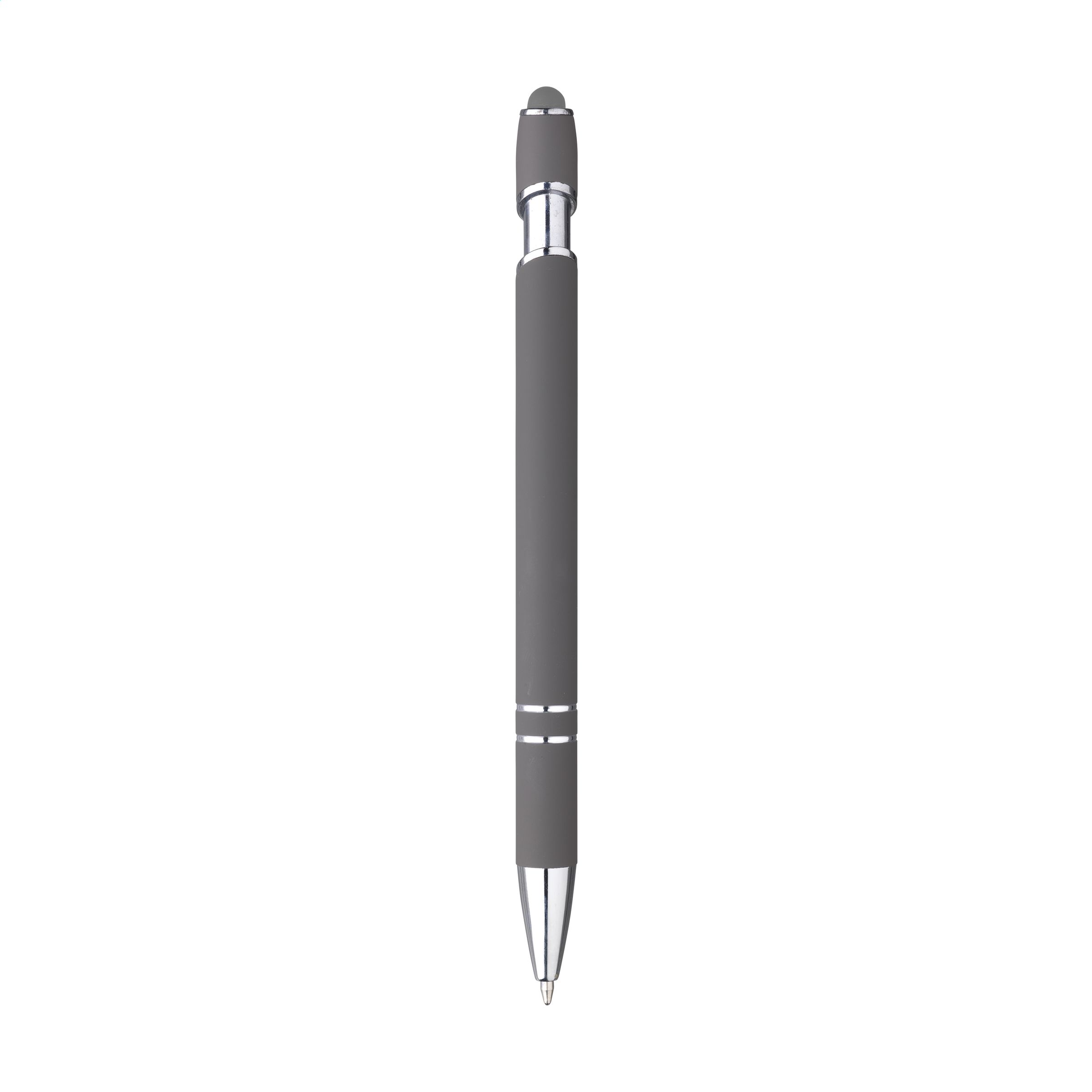 Beschreibung: Schlanker, blauschreibender Kugelschreiber mit Aluminiumgriff. Ausgestattet mit einem gummierten Soft-Touch-Finish und einer Gummi-Spitze. Robuster Metallclip und Kunststoffspitze.