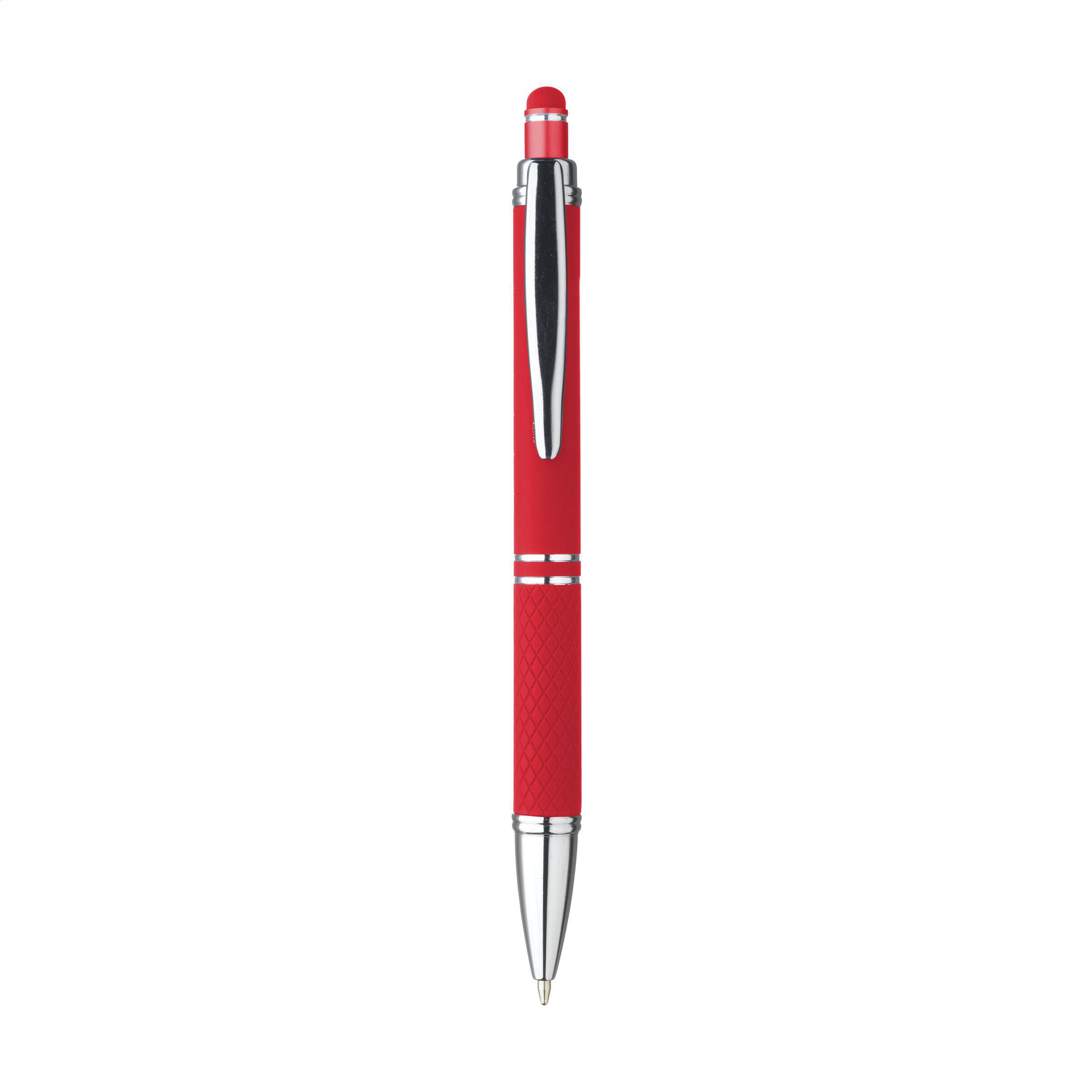 Beschreibung: Blauschreibender Aluminium-Kugelschreiber mit Metallclip und gummierter Spitze für das Bedienen von Touchscreens (wie iPhone/iPad). Der Halter ist mit einer schönen gummierte Soft-Touch-Oberfläche versehen. Auf dem Vorderteil ist ein spielerisches Relief angebracht, das für einen festen Griff sorgt. Bei diesem Stift wurde viel Wert auf kleine zusätzliche Details gelegt. Das macht sein Design auffallend attraktiv.