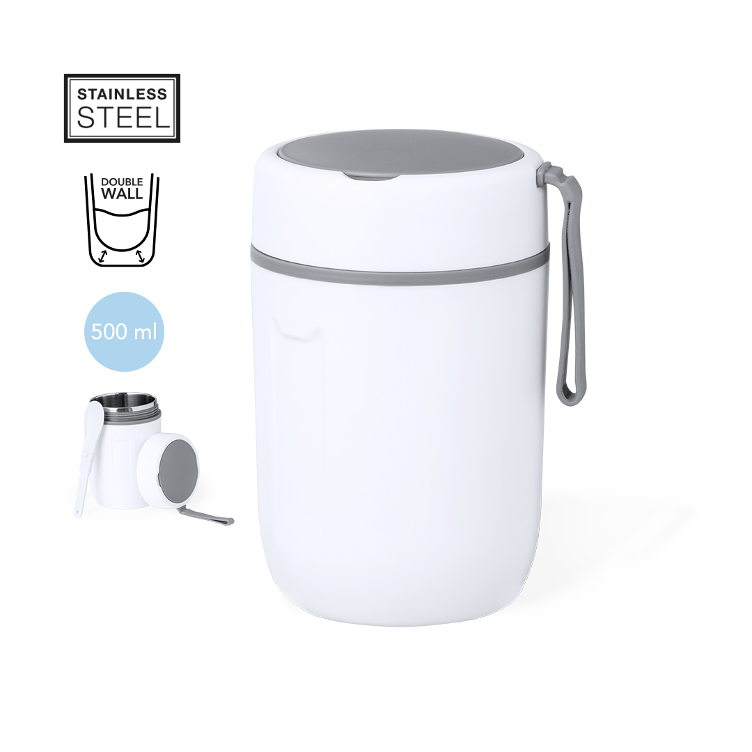 Doppelwandige Lunchbox aus Edelstahl und PP, mit einem Fassungsvermögen von 500 ml. Sicherheitsverschluss mit Schraubdeckel, mit klappbarem Besteck und Tragegriff. Präsentiert in attraktiver Designbox.