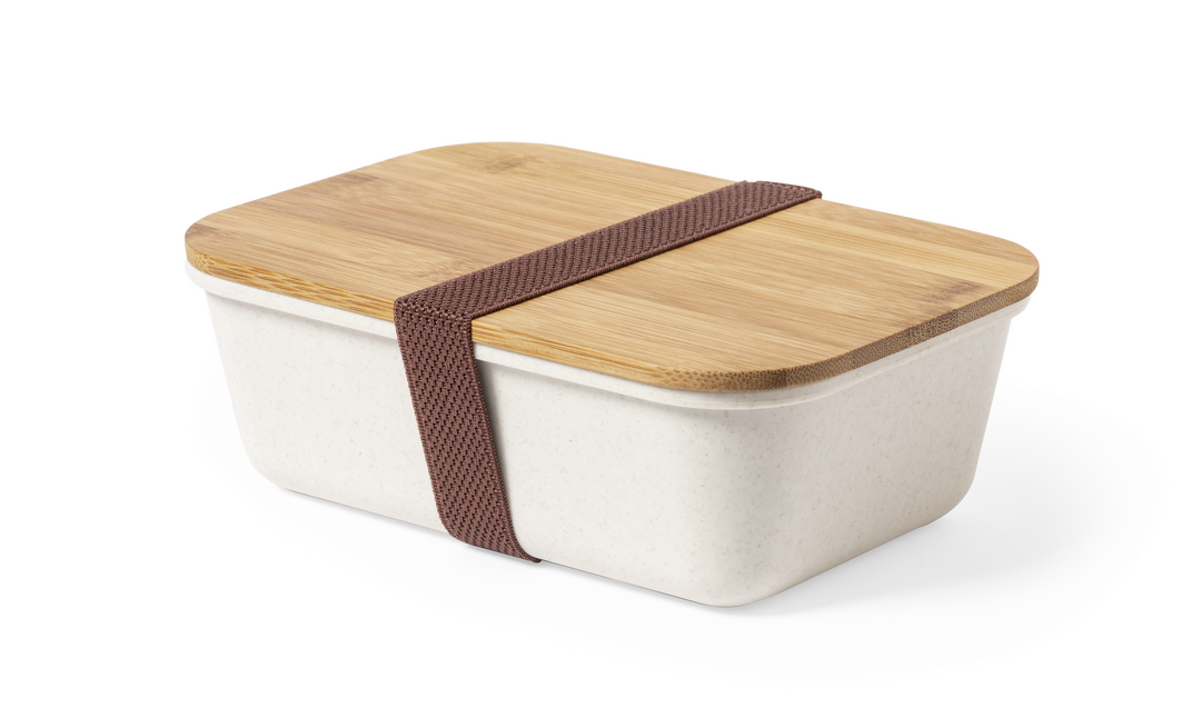 1l Brotdose aus widerstandsfähigem BPA-freiem PP-Kornmaterial, mit Bambusdeckel. Elastisches Sicherheitsband auf dem Deckel und Food Grade-Zertifizierung, die die Sicherheit beim Kontakt von Lebensmitteln mit dem zur Herstellung des Produkts verwendeten Material garantieren.