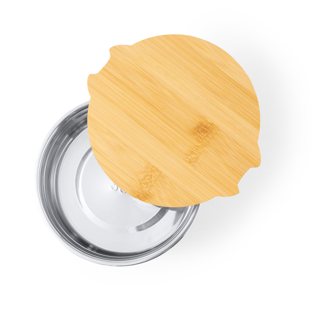 Lunchbox mit einem Fassungsvermögen von 800 ml aus rostfreiem Stahl. Mit luftdichtem Bambusdeckel und Gummibandverschluss. Präsentiert in einer individuellen Designbox.