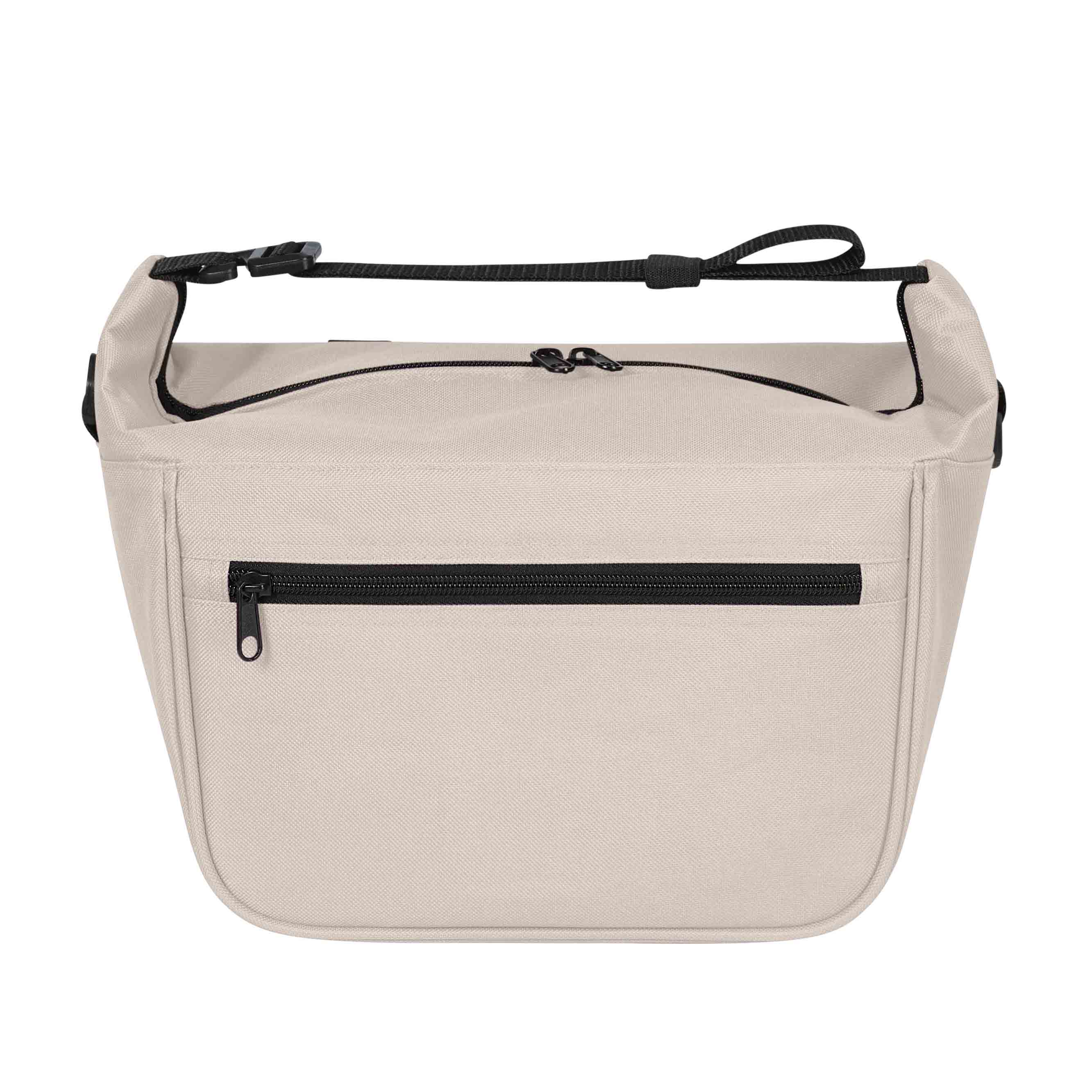 Moderne Kühltasche; Hauptfach mit 2-Wege-Reißverschluss; großzügige Polsterung; innen abwaschbar; einseitig lösbarer, längenverstellbarer Träger mit Gummilasche zur Gurtfixierung; beidseitig D-Ringe zu Befestigung z. B.: für optionalen Schultergurt* oder Schlüssel; Bodenfüße; rückseitig Schlaufen zur Befestigung am Fahrradlenker