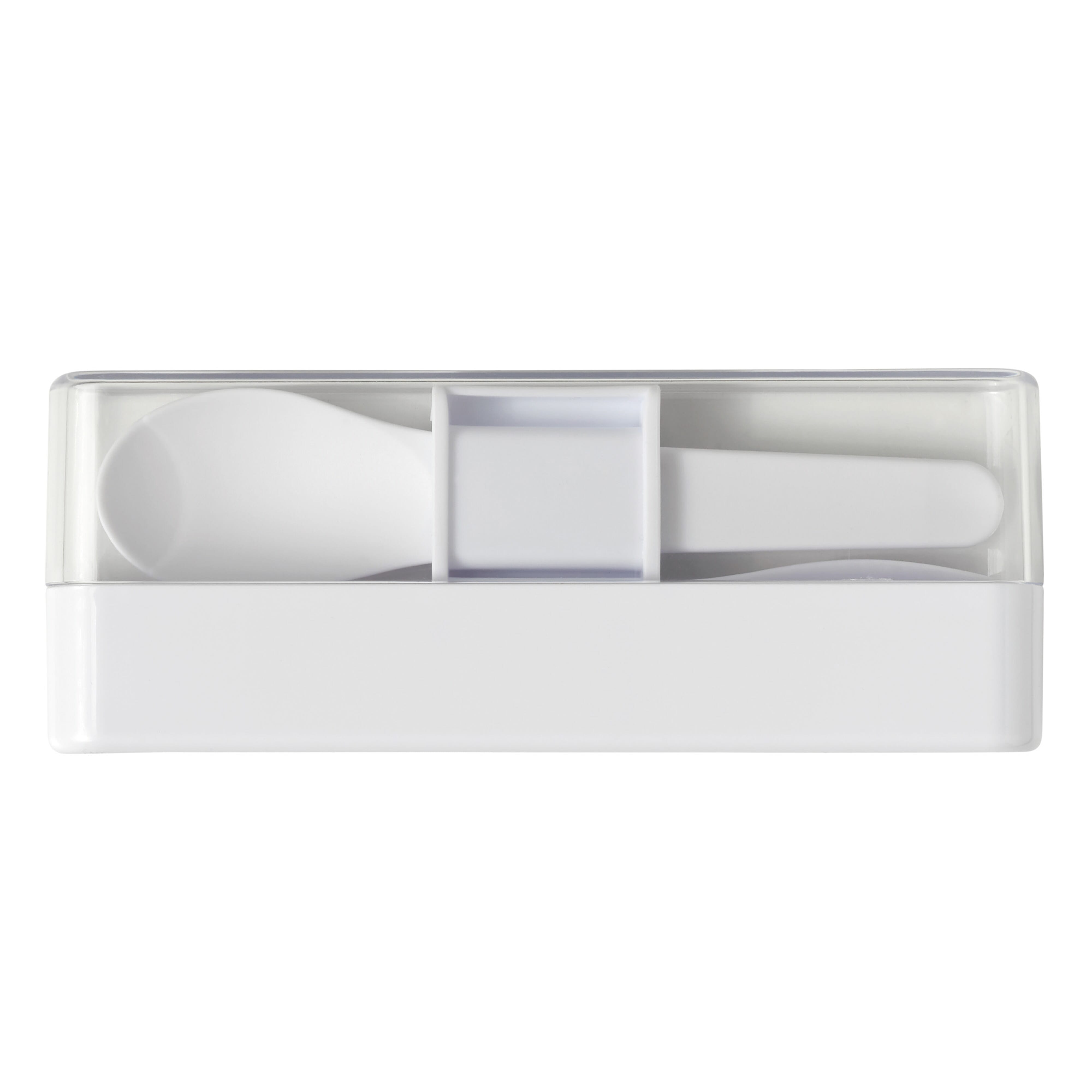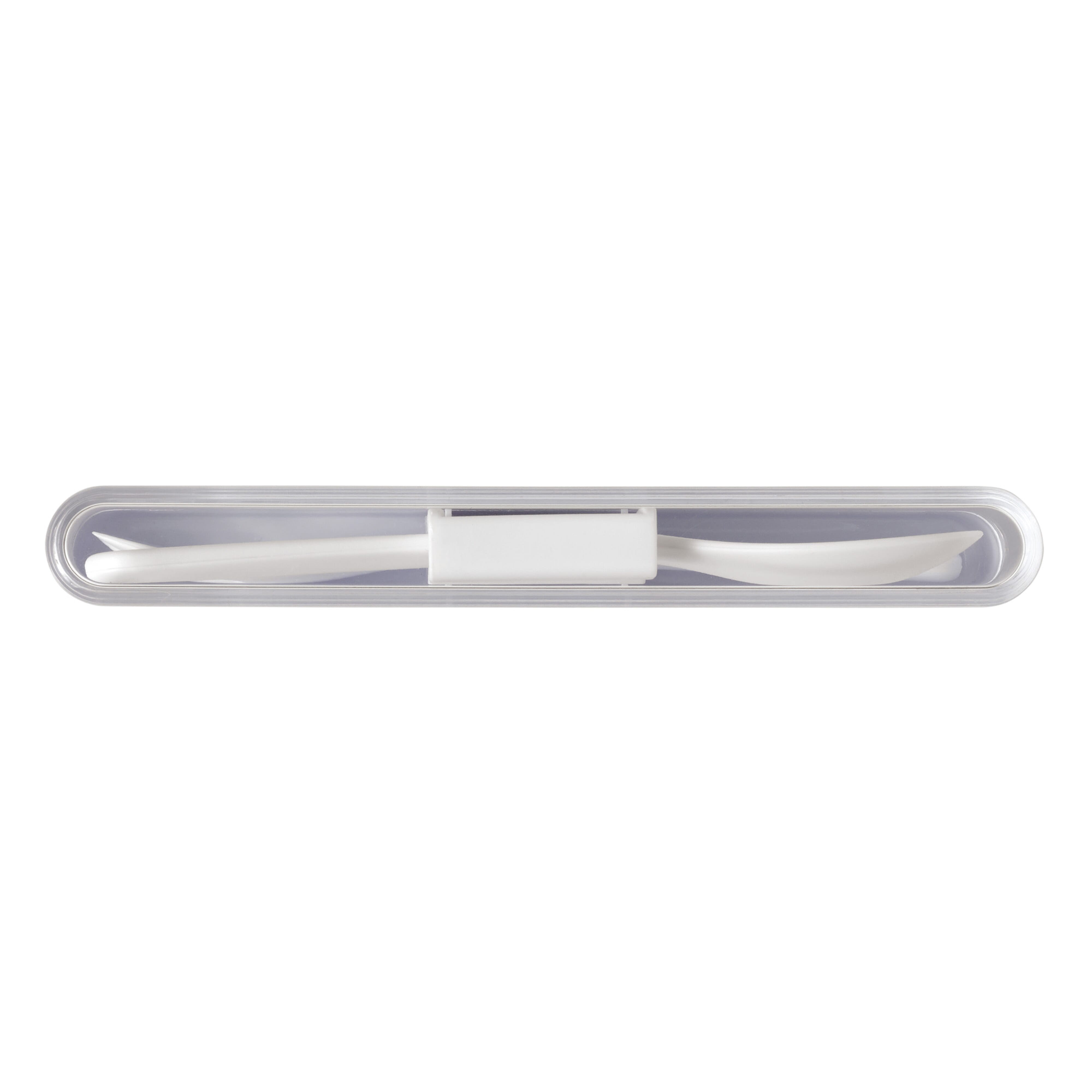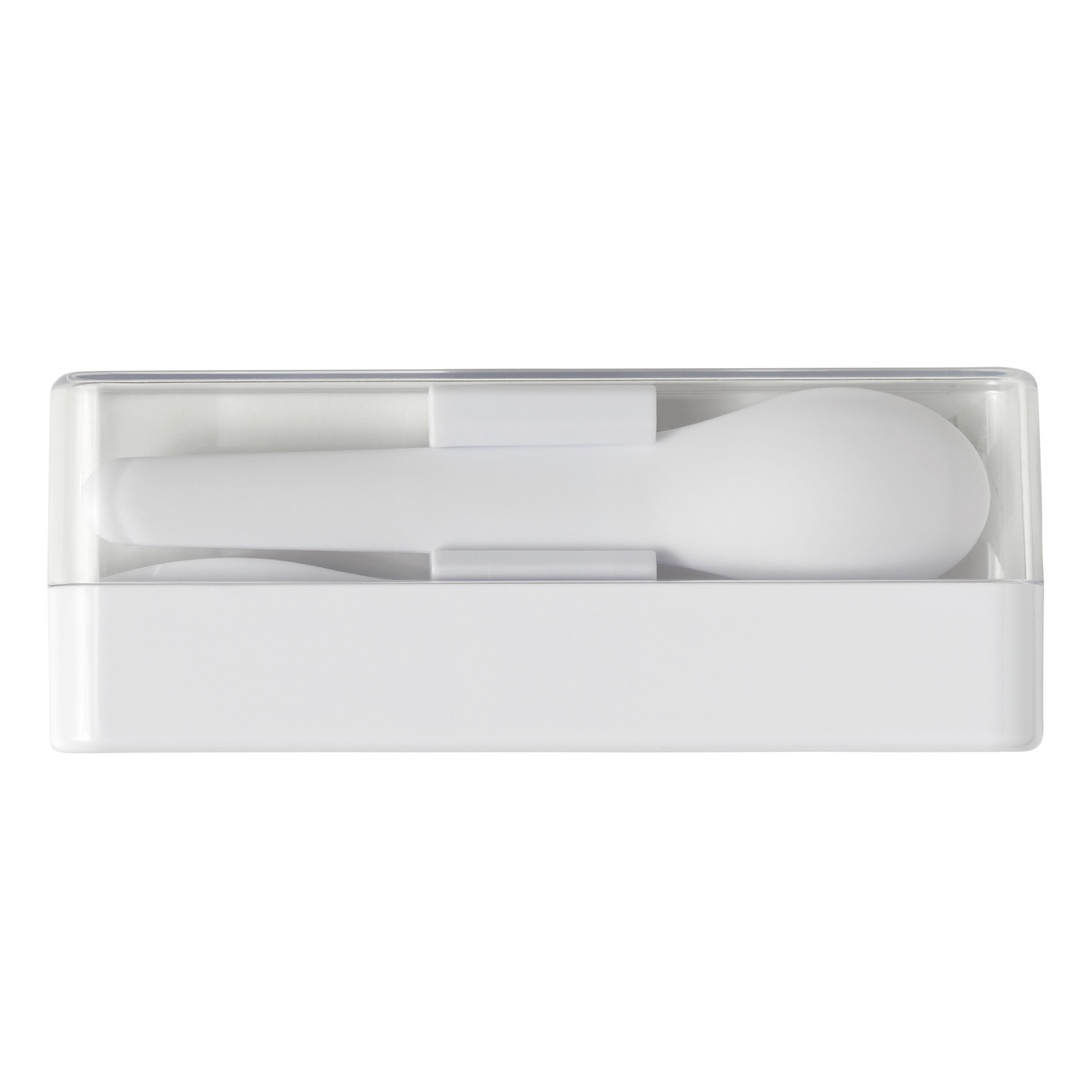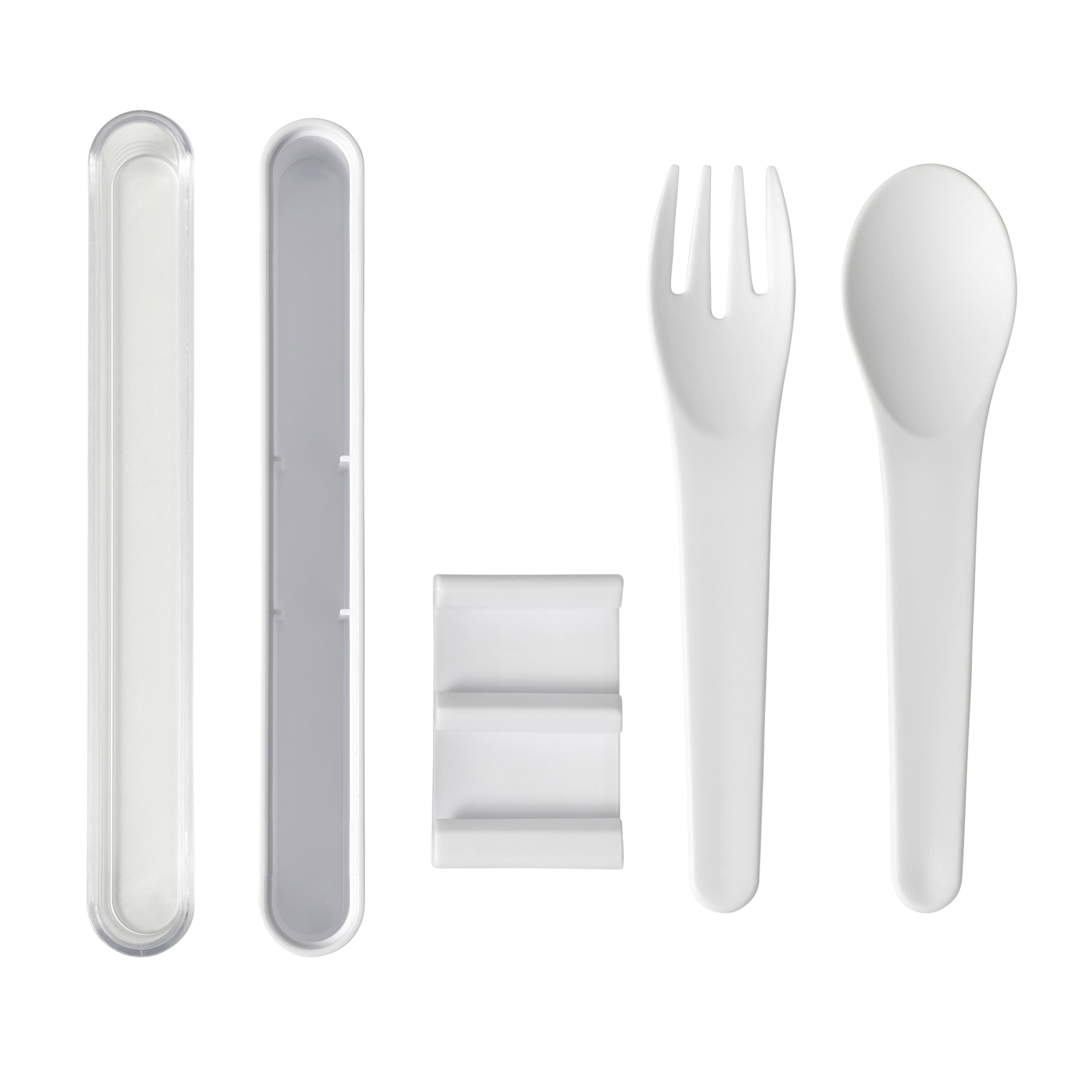 Praktisches Besteckset mit Gabel und Löffel für das Mittagessen. Nach Gebrauch einfach in der Box aufbewahren und so bleibt alles andere in der Tasche sauber.
