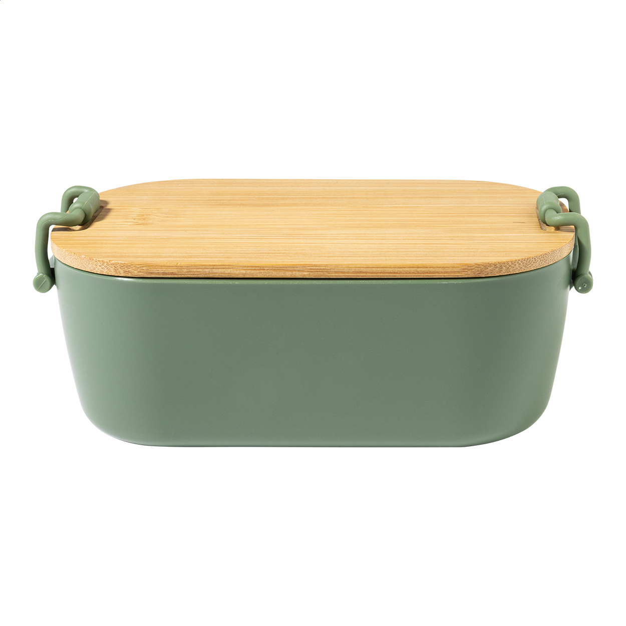 Lunchbox aus PP-Kunststoff mit Bambusdeckel und Schnallenverschluss. Füllmenge: 1000 ml.