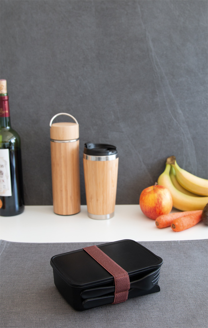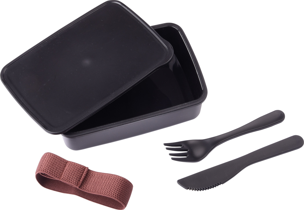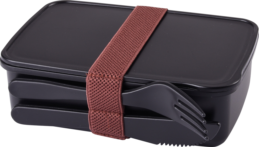 Lunchbox NOONTIME: Box mit Deckel, Gummiband zum Verschließen, Messer und Gabel sind in den Laschen am Gummiband befestigt, Deckel mit Silikondichtung, Füllmenge ca. 700 ml, Zubehör (Gummiband und Besteck) wird in der Box geliefert