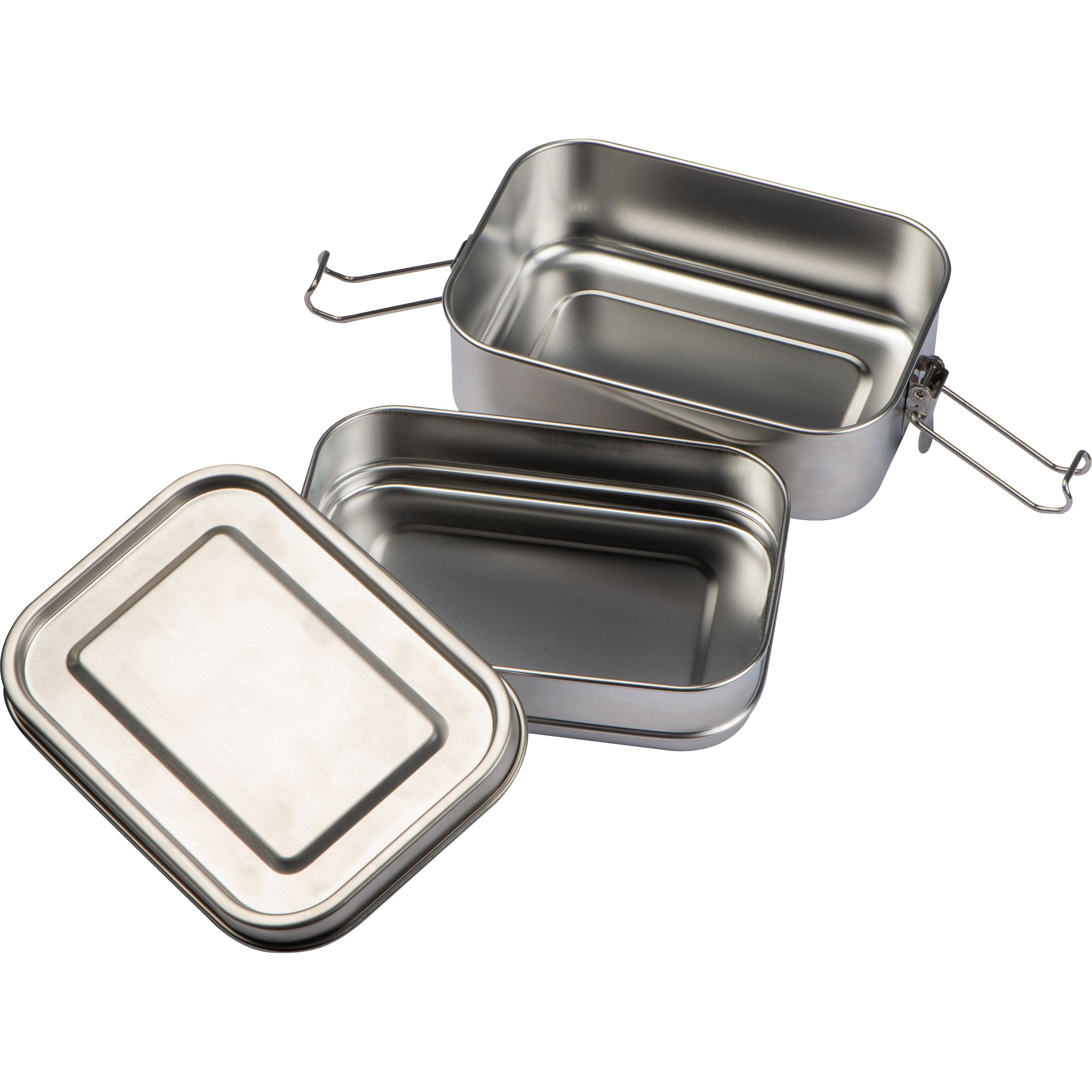 Doppelstöckige, langlebige und robuste Lunchbox (unten 700 ml Fassungsvolumen, oben 450 ml Fassungsvolumen) aus Edelstahl mit verschließbarem Deckel. Ihre Werbung wird auf den Deckel graviert.