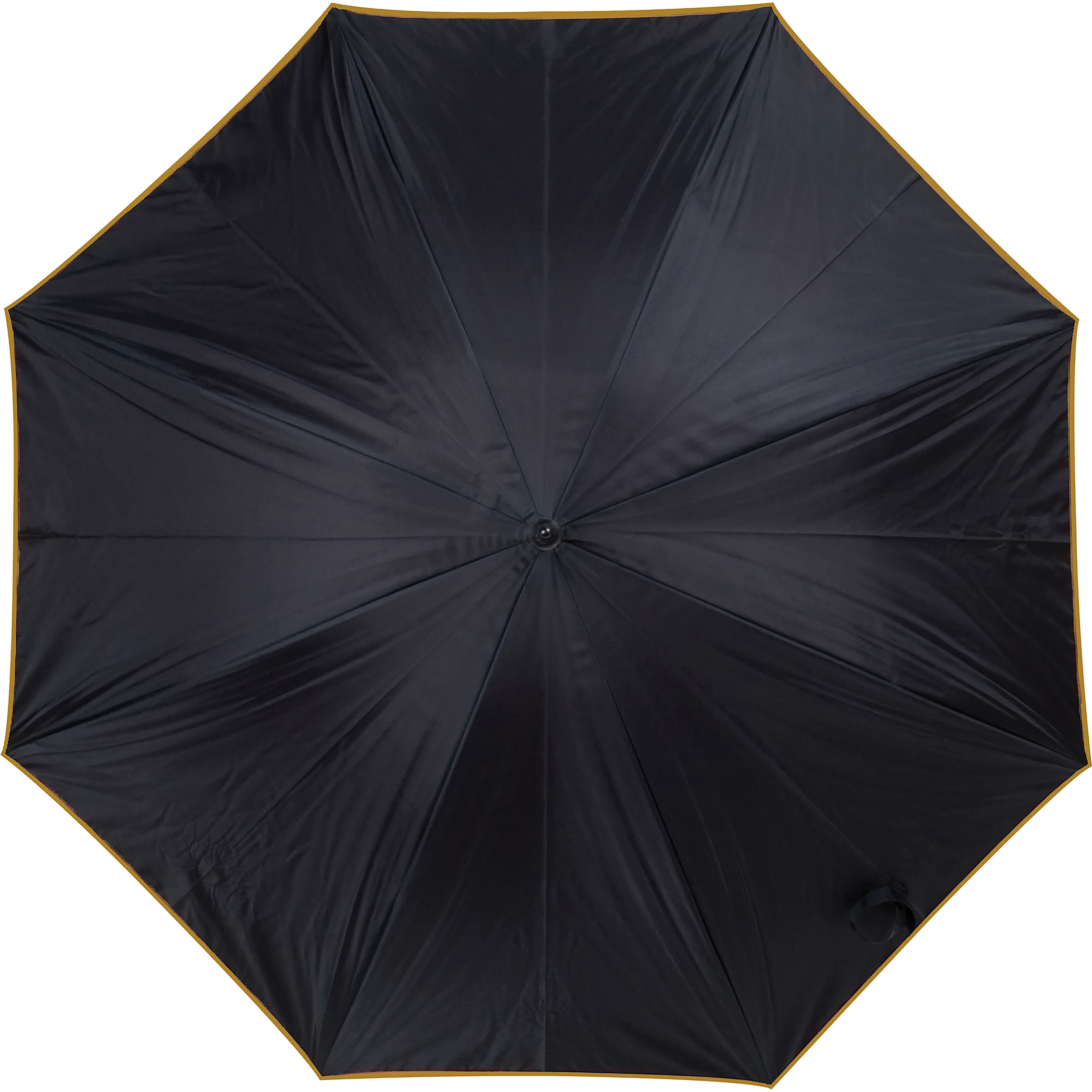 Luxuriöser Regenschirm mit doppelter Bespannung, außen schwarz und innen farbig (190T Polyester). Hochwertigste Verarbeitung. Ihre Werbung drucken wir auf ein Segment.