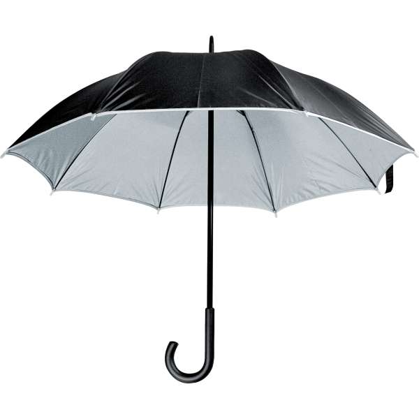 Luxuriöser Regenschirm mit doppelter Bespannung, außen schwarz und innen farbig (190T Polyester). Hochwertigste Verarbeitung. Ihre Werbung drucken wir auf ein Segment.