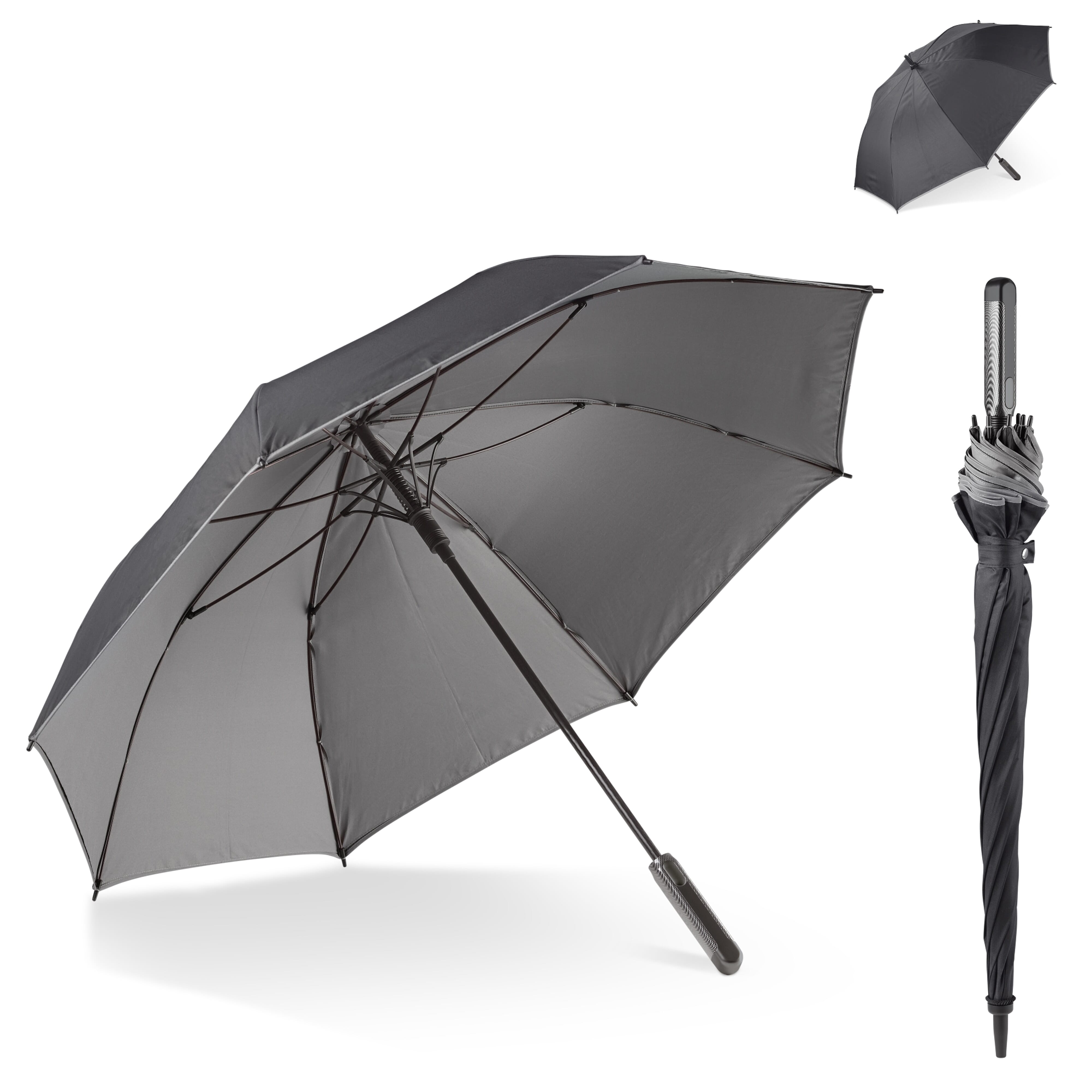Dieser Doppelkappenschirm hält Sie bei allen Bedingungen trocken. Das Gestell aus Fiberglas ist stark und windfest. Der ergonomische Griff mit seinem markanten Design macht diesen Schirm zu einem absoluten Muss.