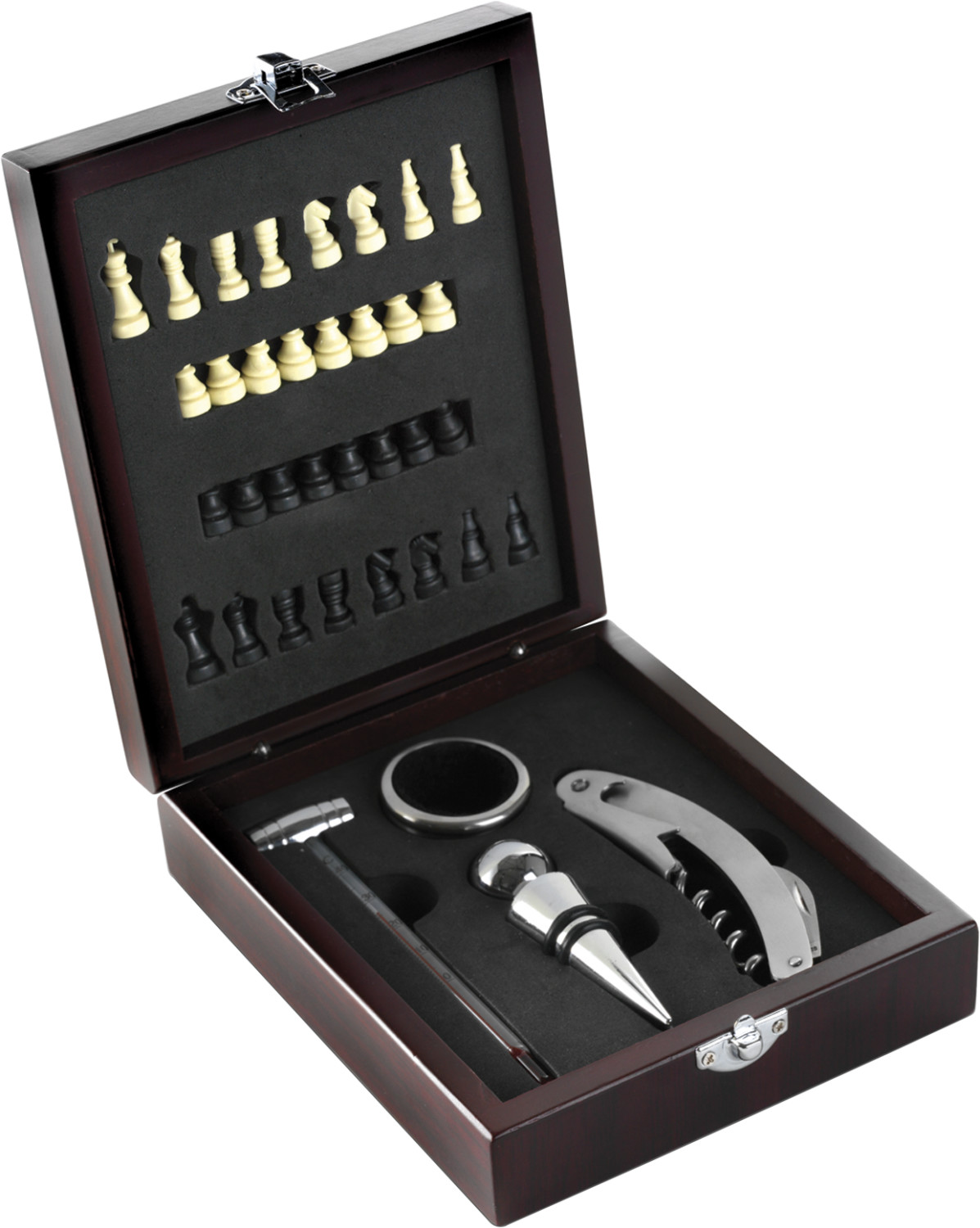 Luxus-Weinset, 5-tlg., mit einem Kellnermesser, Tropfring, Flaschenverschluss und Weinthermometer, inklusive Schachspiel und Figuren in einer Holz-Geschenkbox.