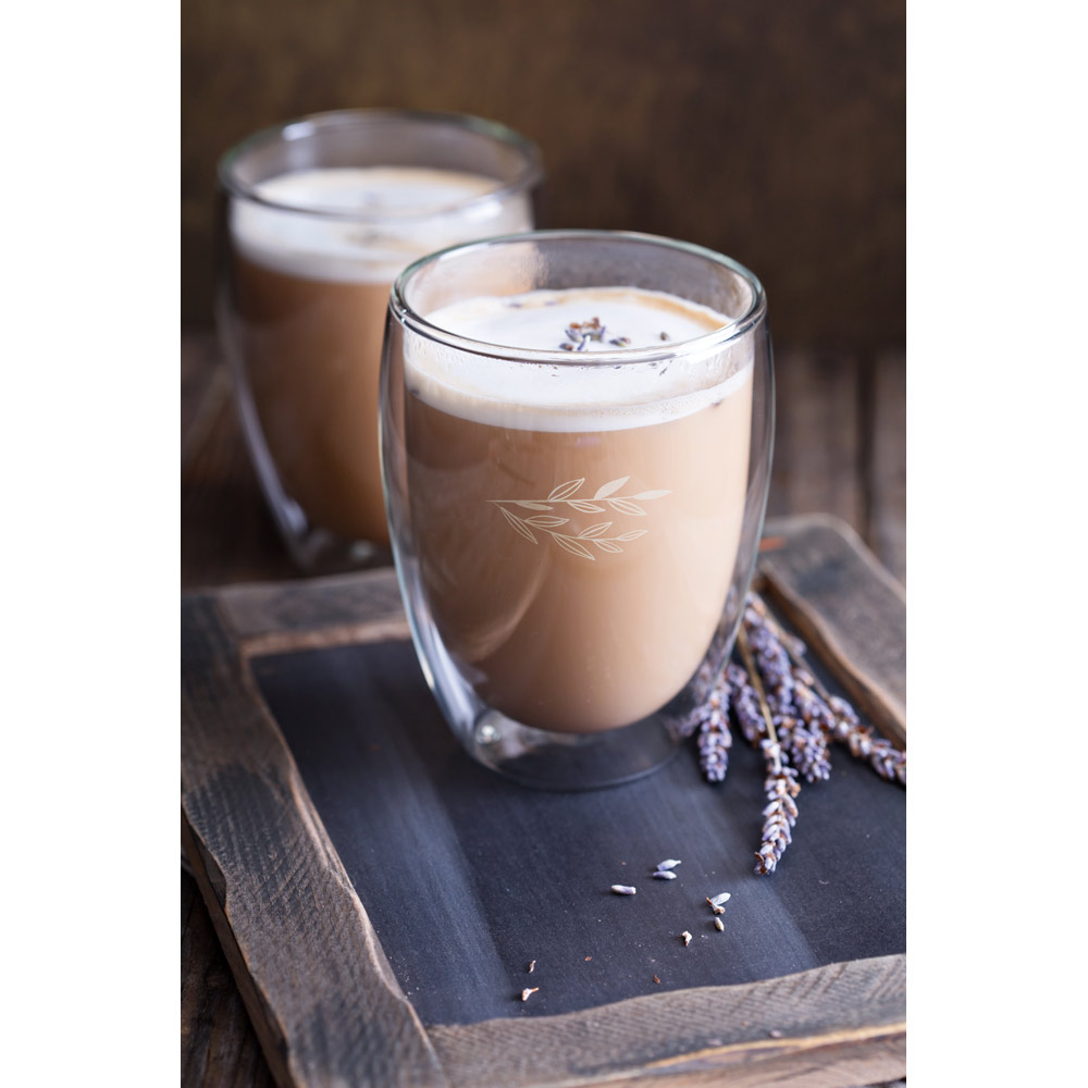 Kaffeeglas-Set aus doppelwandigem Borosilikatglas (350 mL). Geliefert in einer veredelbaren Geschenkschachtel. Schachtel: 195 x 125 x 95 mm