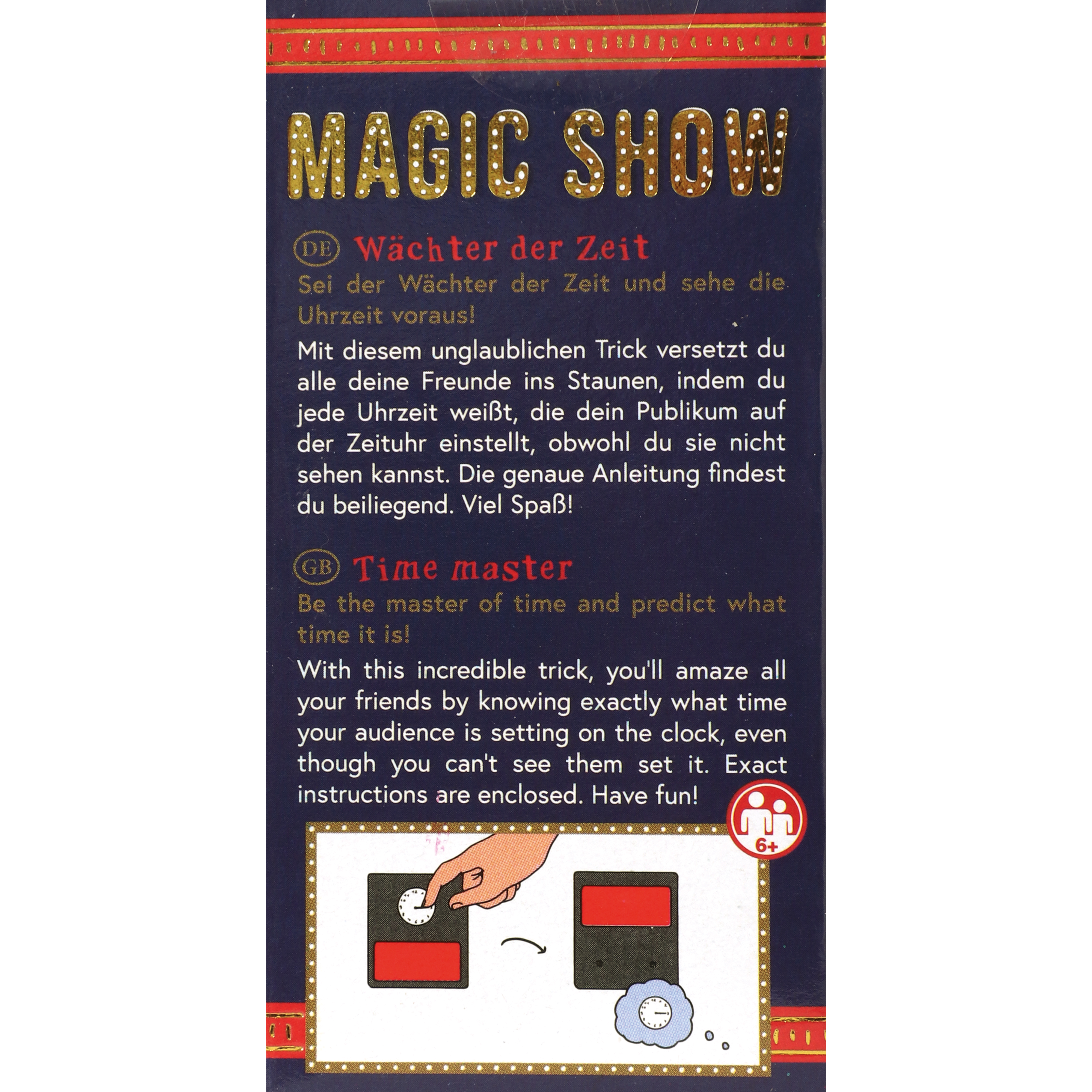 Sei der Wächter der Zeit und sehe die Uhrzeit voraus! Mit diesem unglaublichen Trick versetzt du alle deine Freunde ins Staunen, indem du jede Uhrzeit weißt, die dein Publikum auf der Zeituhr einstellt, obwohl du sie nicht sehen kannst. Die leicht verständliche, bebilderte Anleitung zeigt dir, worauf es bei dieser verblüffenden Illusion ankommt. Zusätzlich erhältst du 5 Tickets, mit denen du zu deiner eigenen MAGIC SHOW einladen kannst. Geeignet für Nachwuchszauberer ab 6 Jahren.