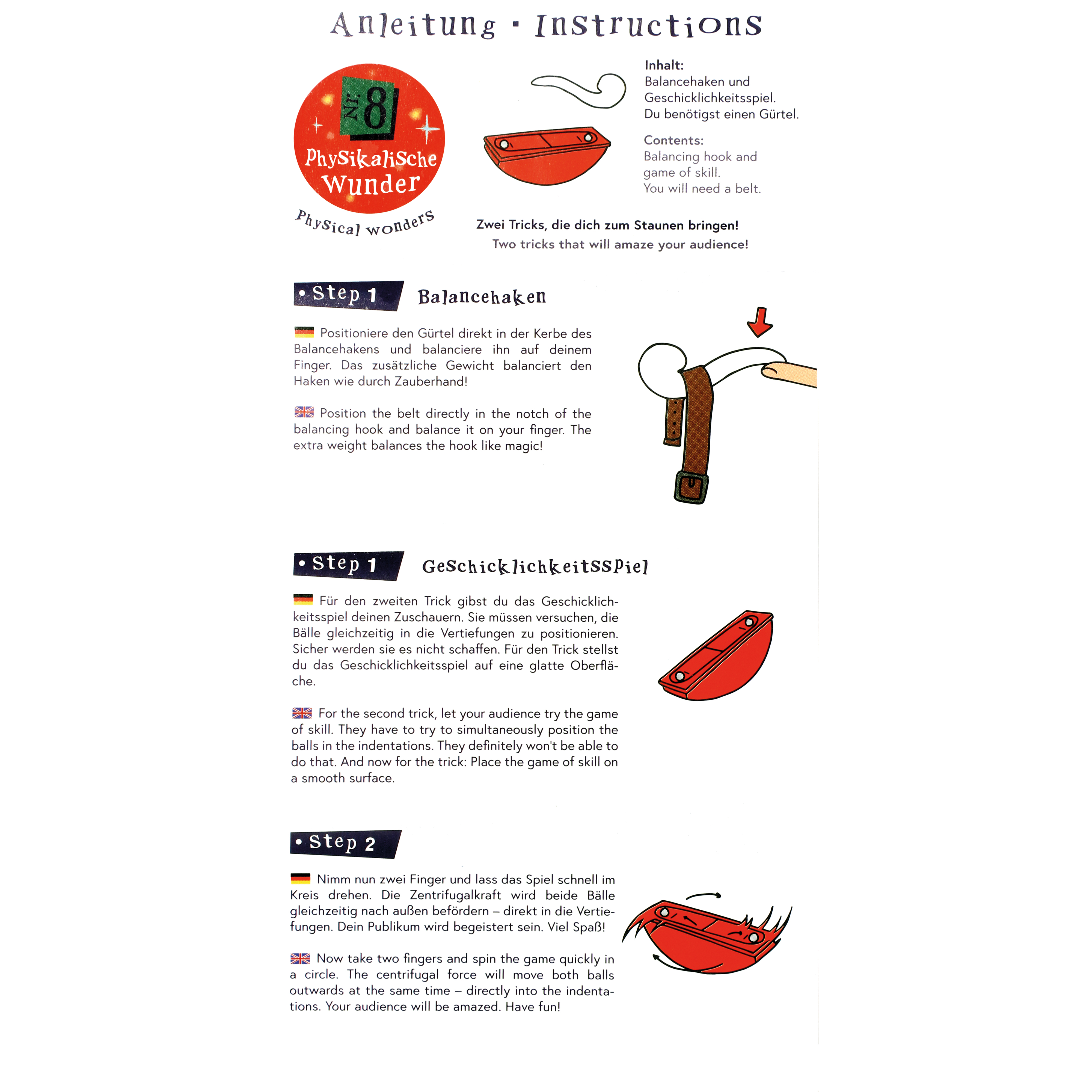 Zwei Tricks, die dich zum Staunen bringen! Präsentiere deinen Zuschauern zwei knifflige Rätsel, die kaum zu schaffen sind, und verblüffe sie mit deiner sensationellen Lösung! Mit diesem Set kannst du einen Haken balancieren und ein Geschicklichkeitsspiel mit Kugeln lösen. Die leicht verständliche, bebilderte Anleitung zeigt dir, worauf es bei dieser verblüffenden Illusion ankommt. Zusätzlich erhältst du 5 Tickets, mit denen du zu deiner eigenen MAGIC SHOW einladen kannst. Geeignet für Nachwuchszauberer ab 6 Jahren.
