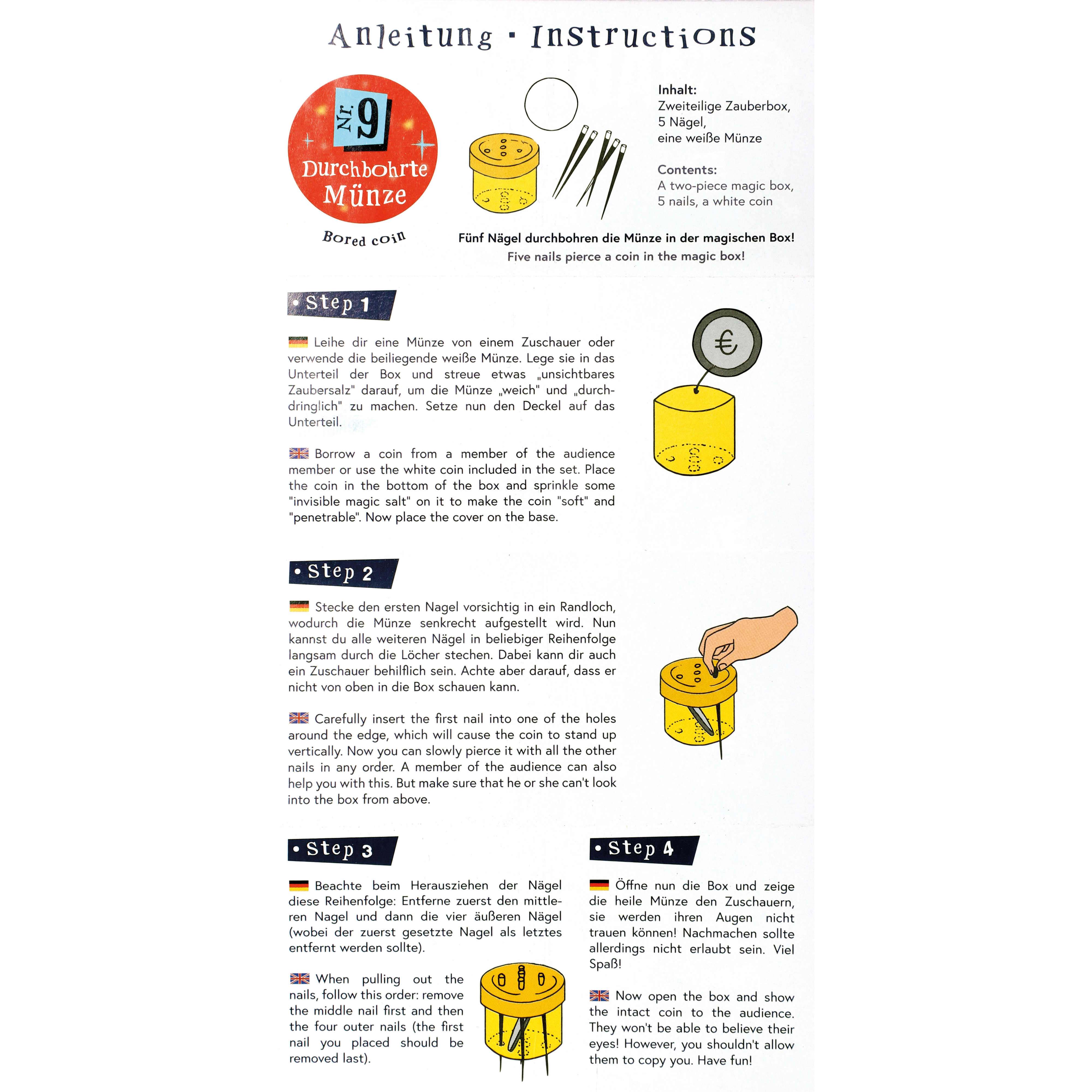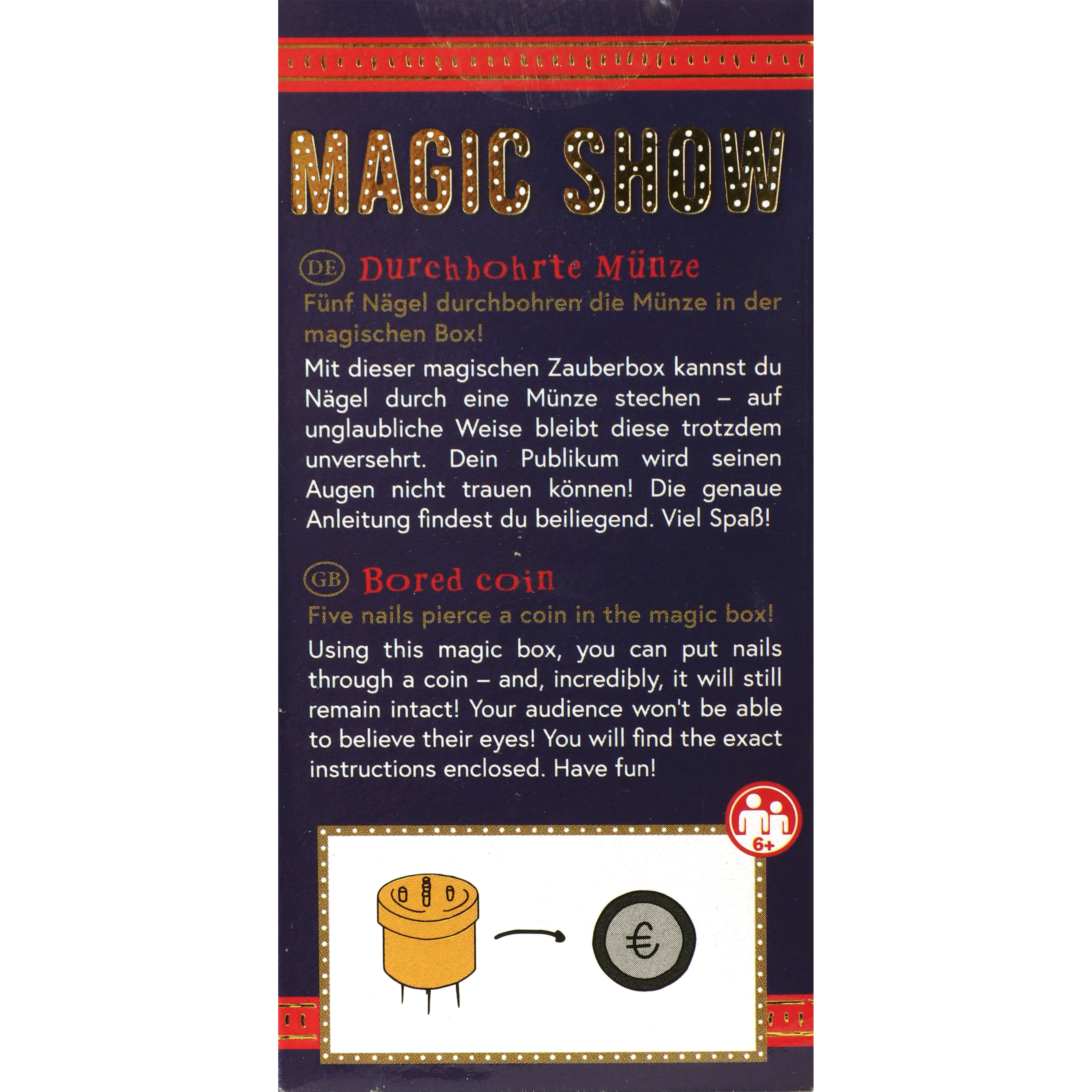 Fünf Nägel durchbohren die Münze in der magischen Box! Mit dieser magischen Zauberbox kannst du Nägel durch eine Münze stechen - auf unglaubliche Weise bleibt diese trotzdem unversehrt. Die leicht verständliche, bebilderte Anleitung zeigt dir, worauf es bei dieser verblüffenden Illusion ankommt. Zusätzlich erhältst du 5 Tickets, mit denen du zu deiner eigenen MAGIC SHOW einladen kannst. Geeignet für Nachwuchszauberer ab 6 Jahren.